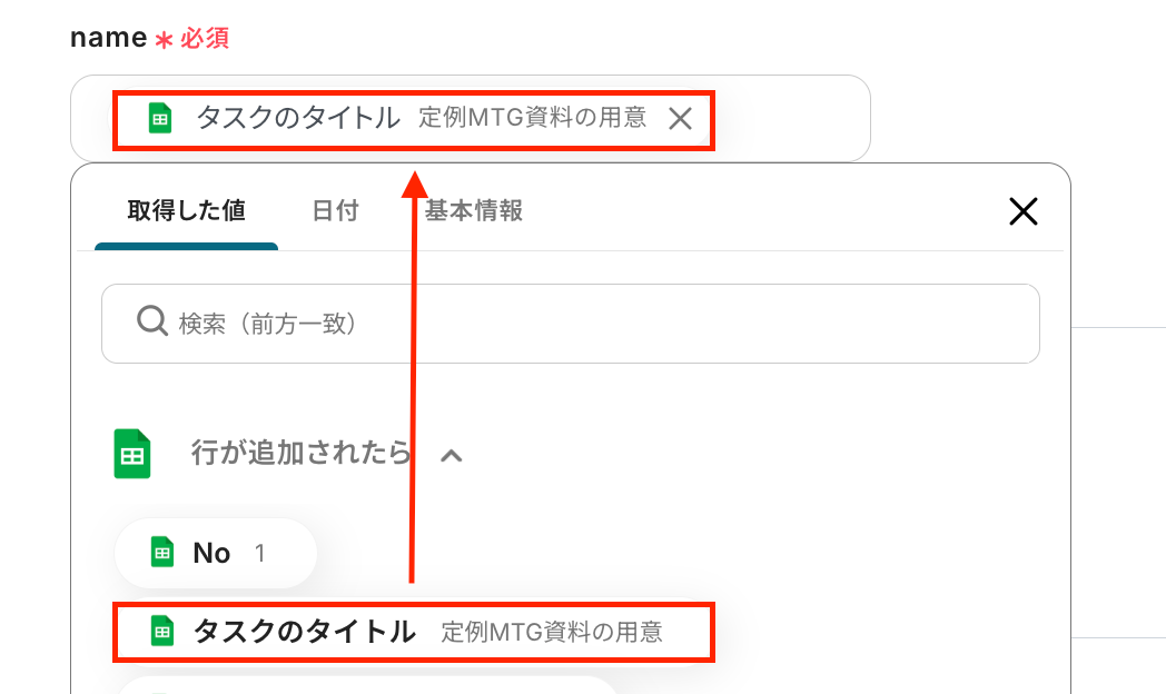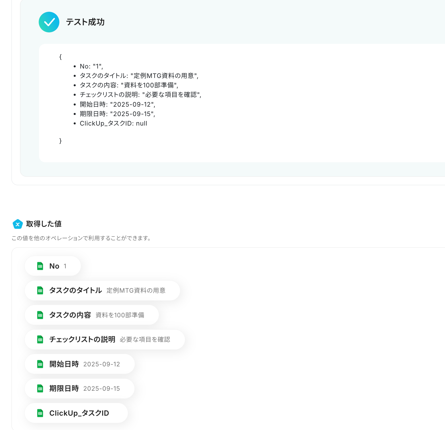 テストを成功させることで「取得した値」が取得でき、前述したように後続のオペレーション設定時に活用できます。