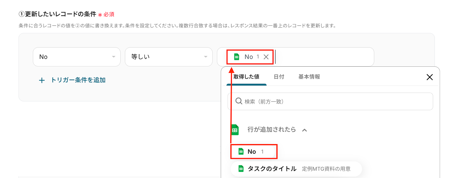 A:はい、トリガー直下に「分岐条件の設定」を入れることで、指定する条件に一致するタスク情報のみを連携できるようになります。