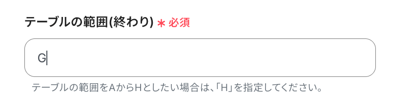 この場合、情報を取得したいテーブル範囲は「A列からG列」となるため、「テーブルの範囲(始まり)」には「A」と入力します。