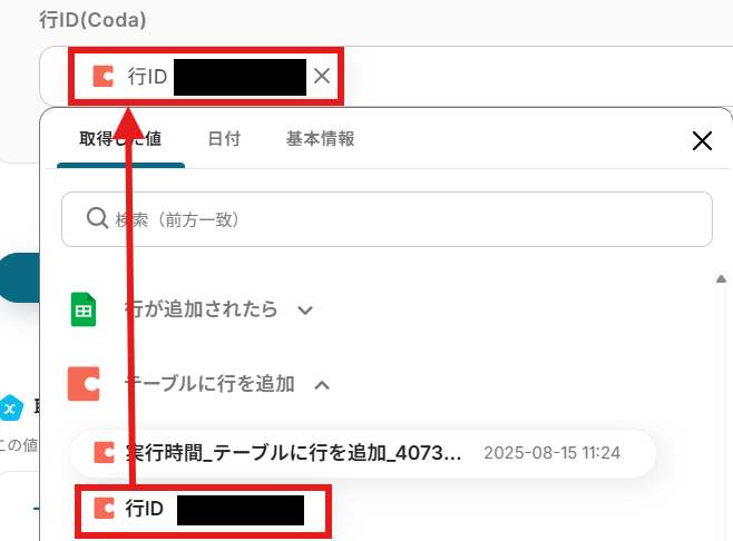 「取得した値」(アウトプット)は変数となるため、このように設定することでGoogle スプレッドシートで行が追加されるたびに、追加された情報をCodaへ自動連携できます。