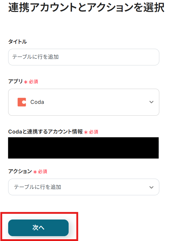 タイトルと連携するアカウント情報を確認し、アクションはテンプレート通りのまま「次へ」をクリックして進んでください。