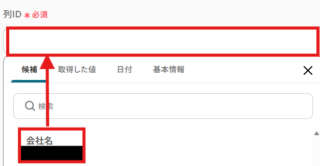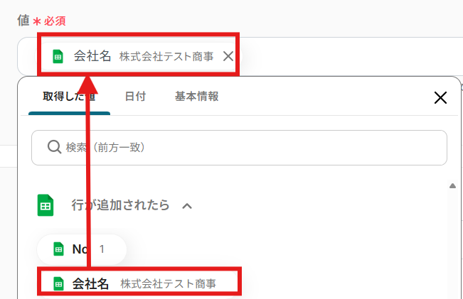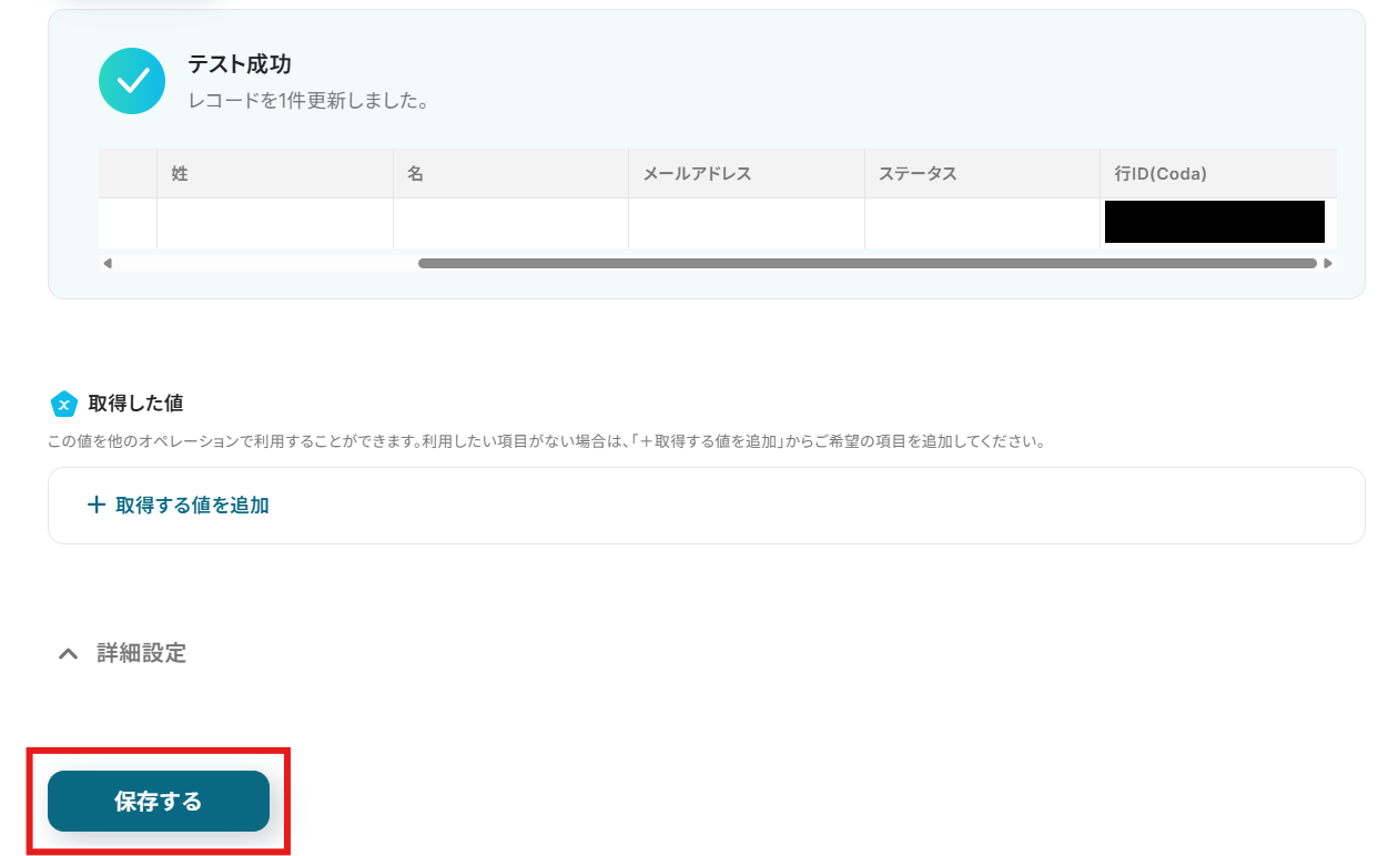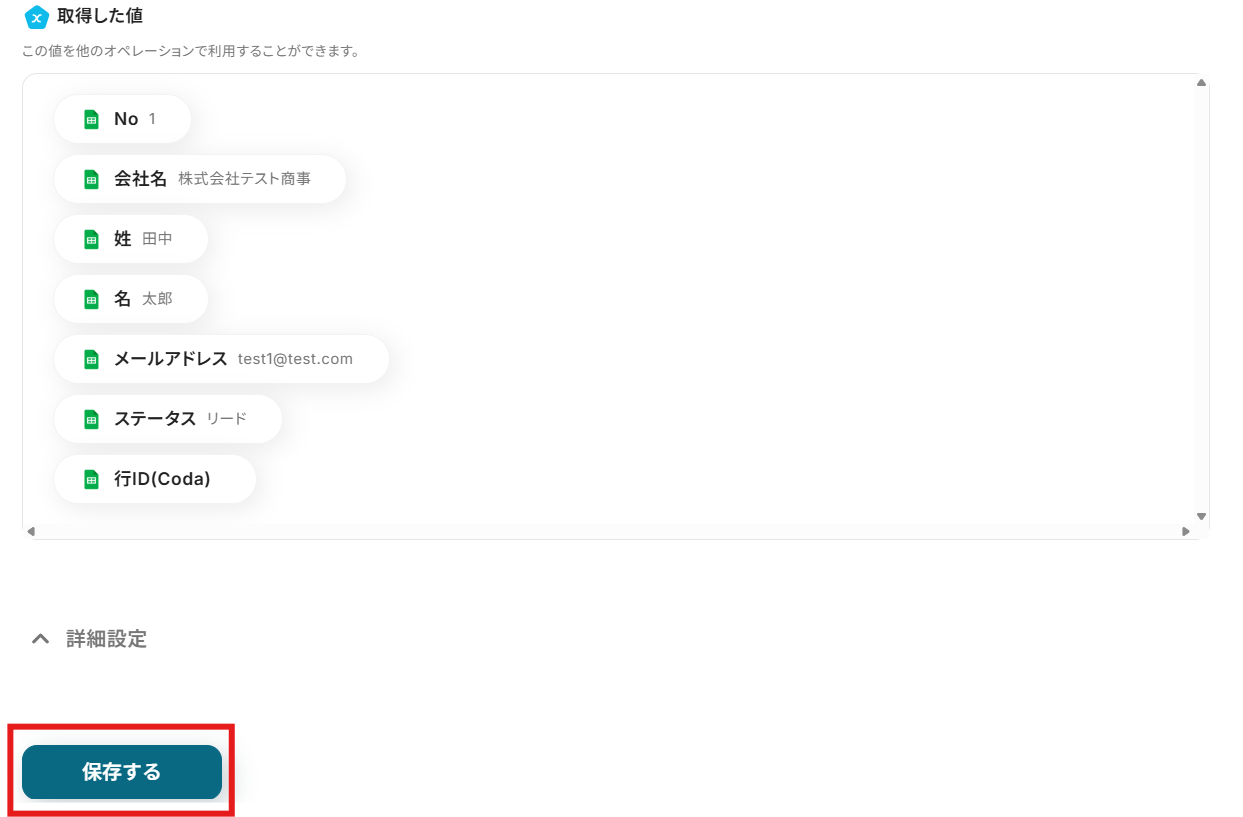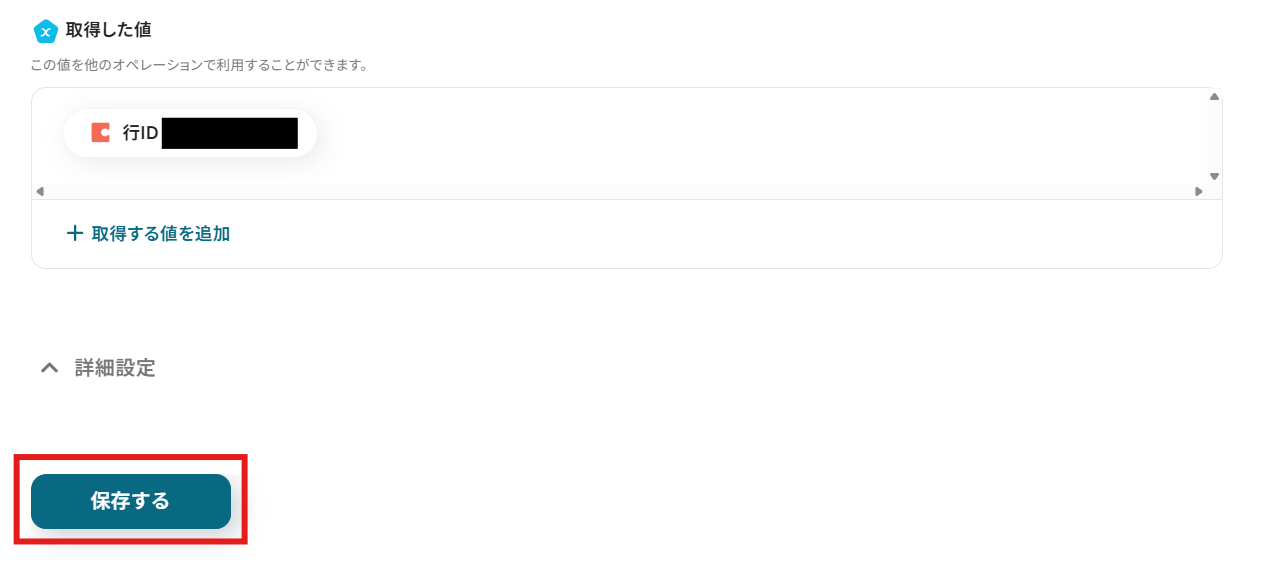 また、テストに成功すると「取得した値」(アウトプット)に行IDが反映されるので、「保存する」を選択しましょう。