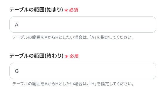 「テーブルの範囲(始まり)」と「テーブルの範囲(終わり)」を設定します。