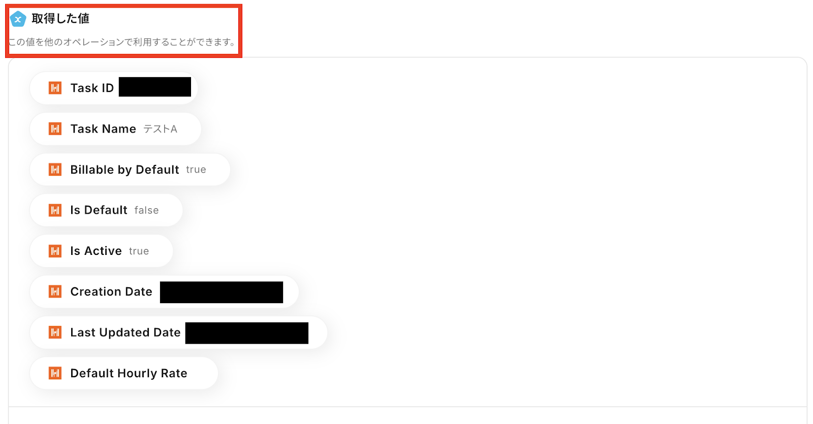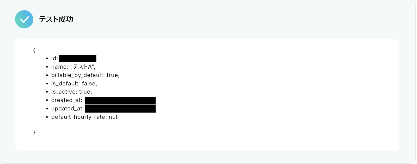 「テスト成功」と表示が出たら、アウトプット(取得した値)が取得されます。