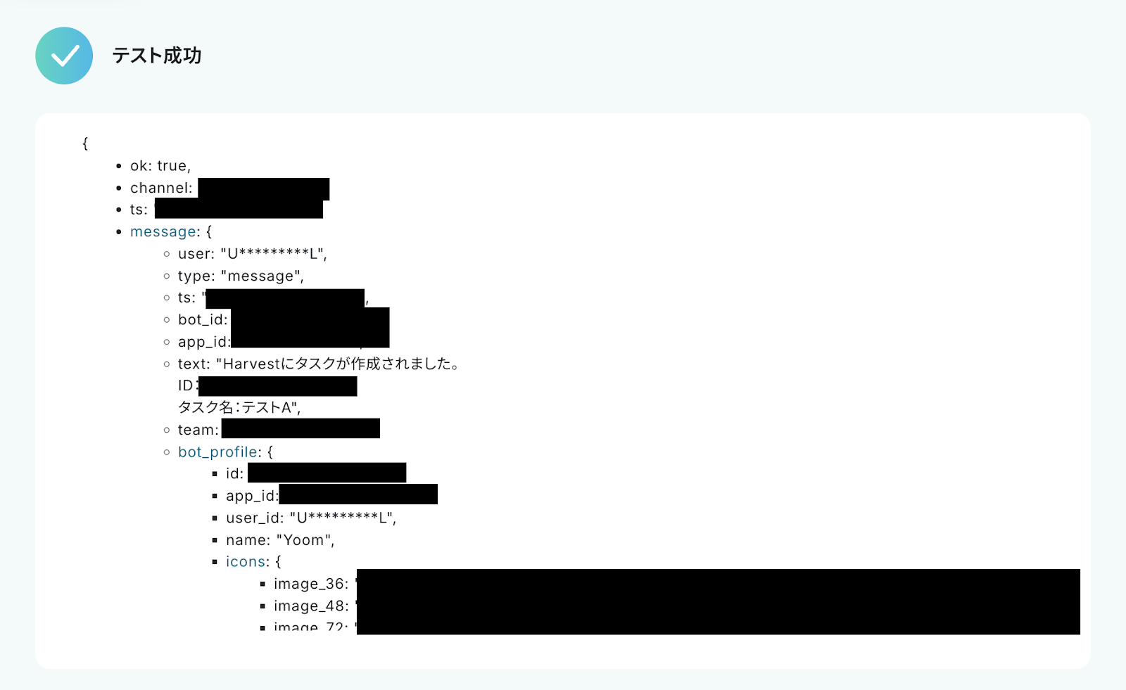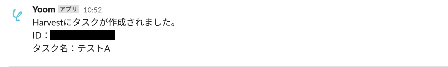 テスト成功という表示がされたら、SlackにHarvestでタスクが作成されたことを知らせるメッセージが届いています。