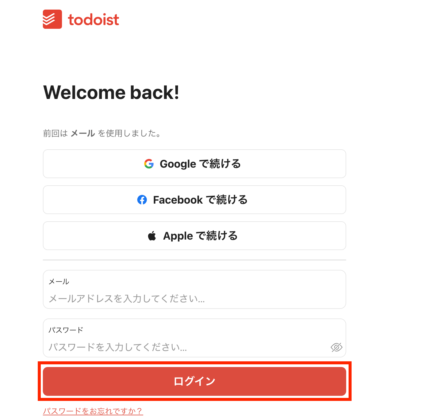 Todoistにログインします。 メールとパスワードを記入して「ログイン」ボタンを押しましょう。