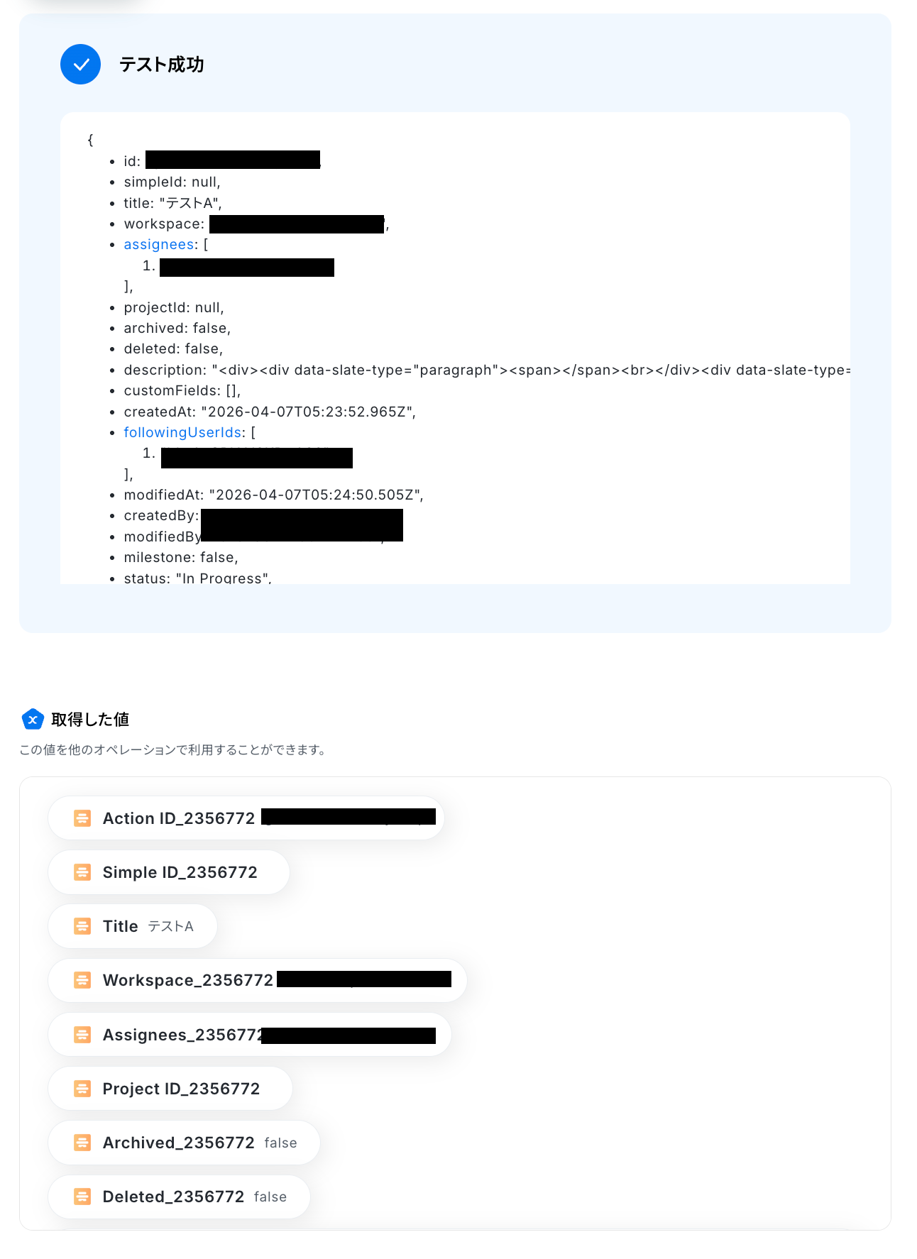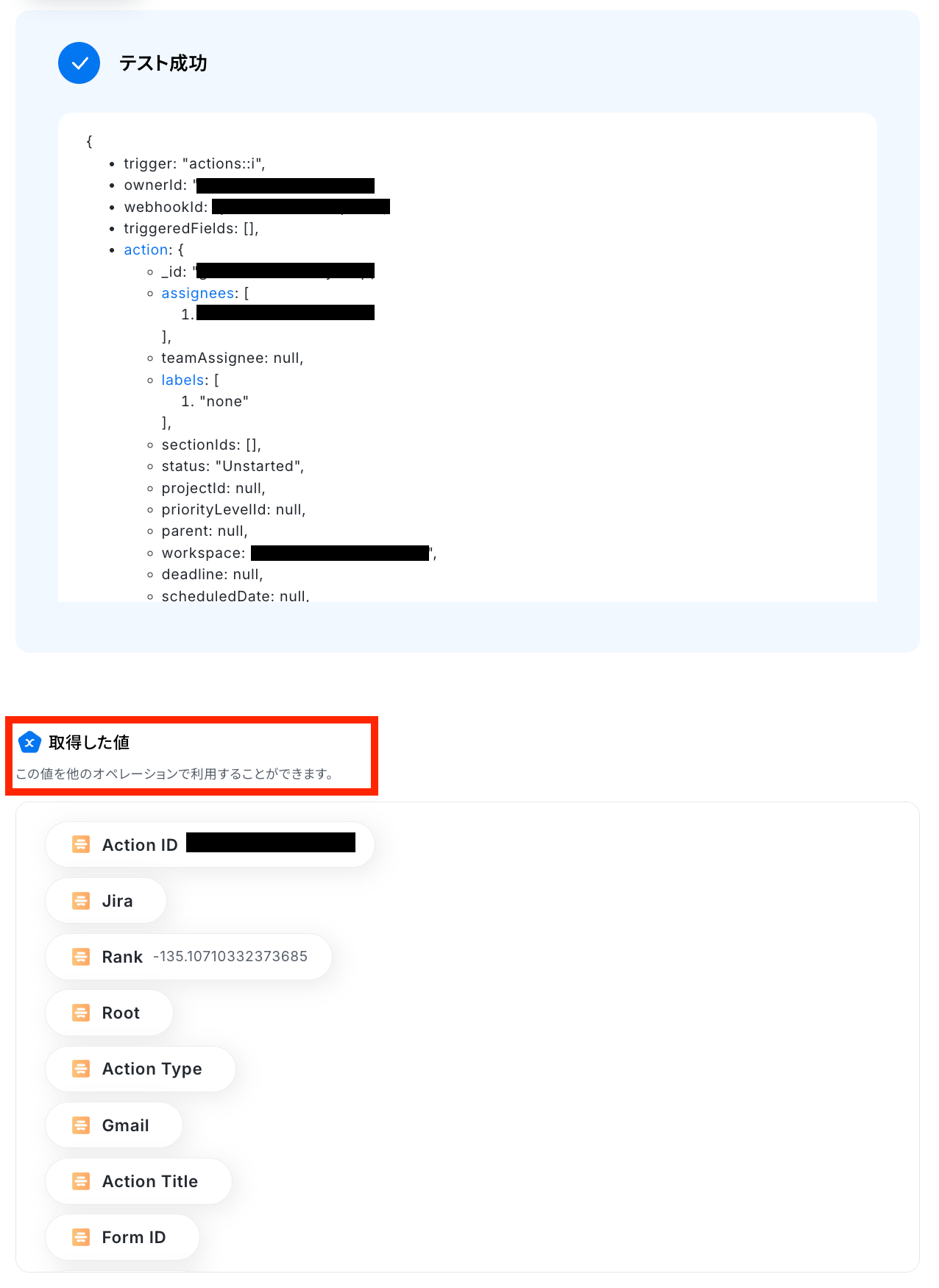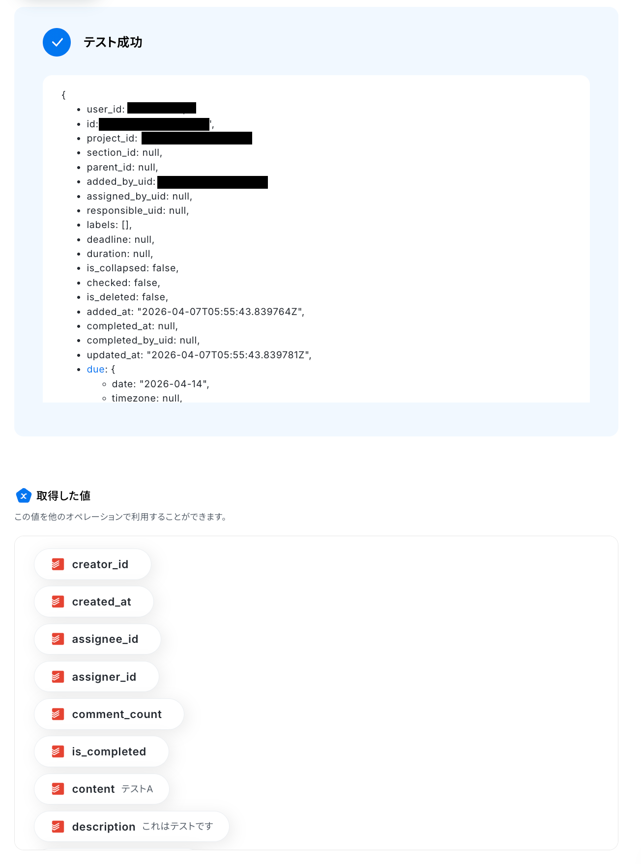 「テスト成功」と表示が出たら、取得した値 が取得されます。