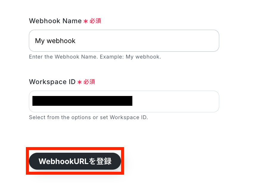 Webhookを登録します。 Webhookの名前を任意で設定したら、Workspace IDを候補から選択するかHive上で確認して設定します。