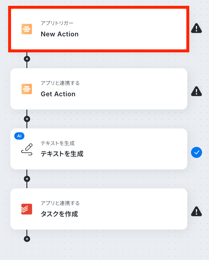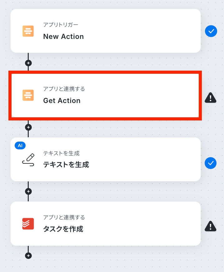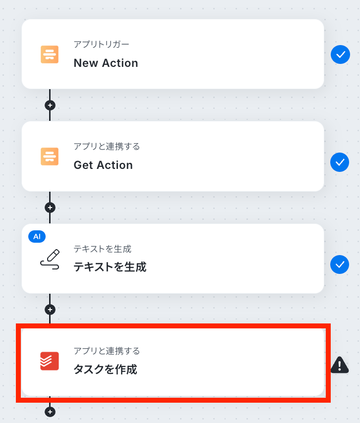 ステップ6:Todoistのアクション設定 取得した値を用いて、Todoistでタスクを作成する設定を行います。 最後の赤枠をクリックしましょう。
