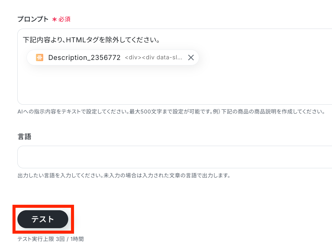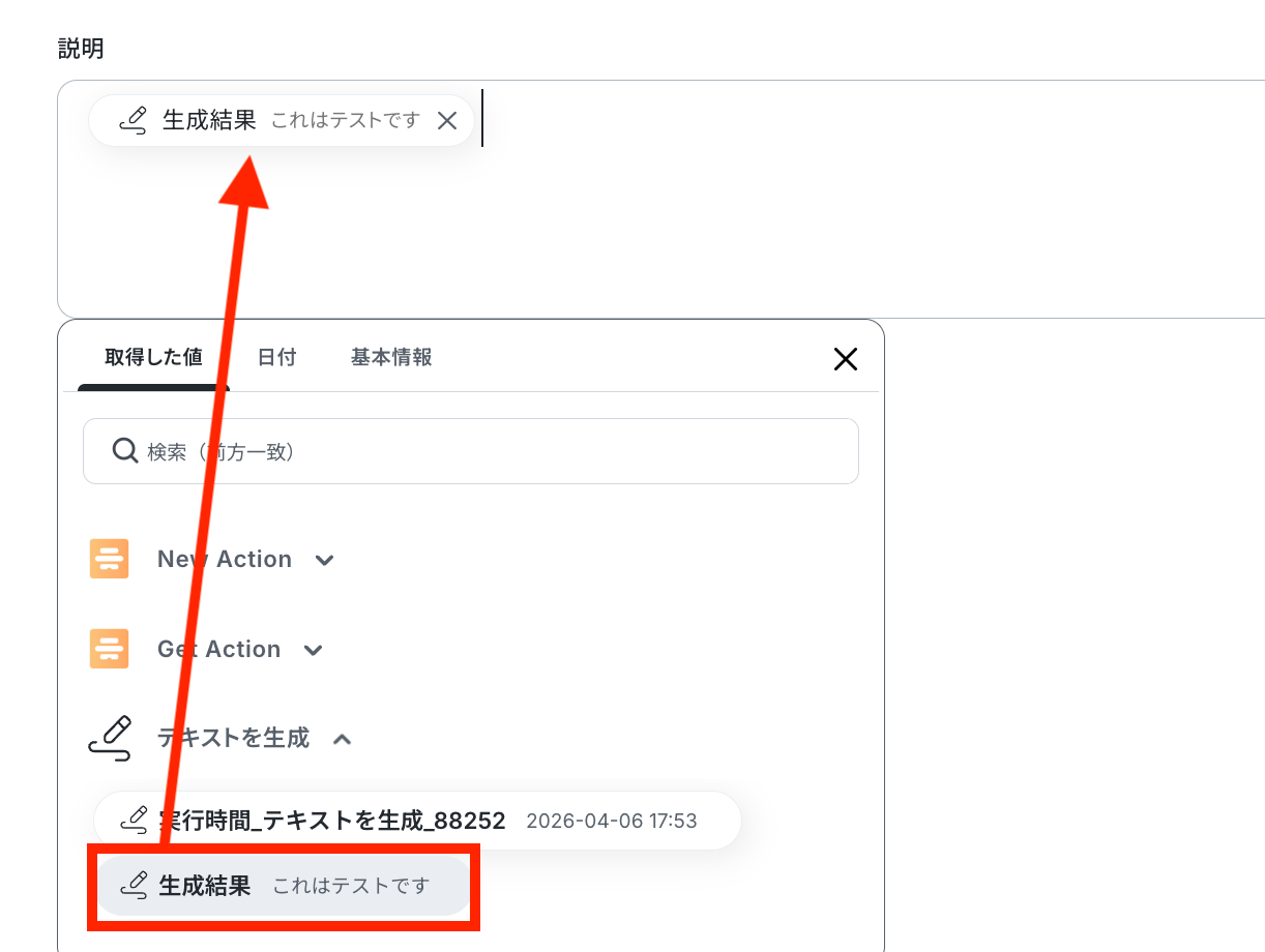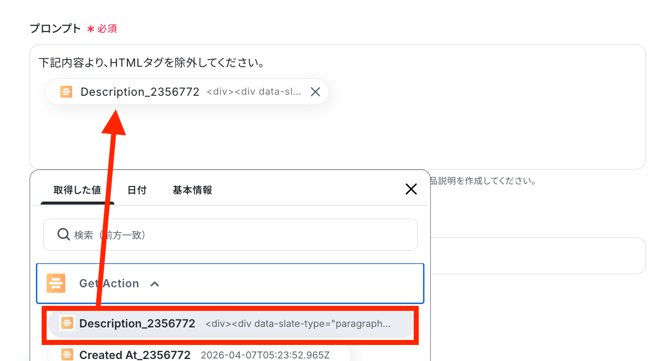プロンプトを作成します。 行いたいアクションの文言を作成して、取得した値から「Description」を選択しましょう。