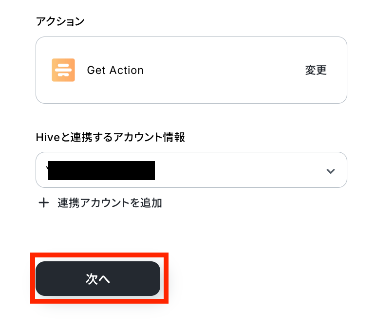 アクションはそのままで、Todoistと連携するアカウント情報を確認します。