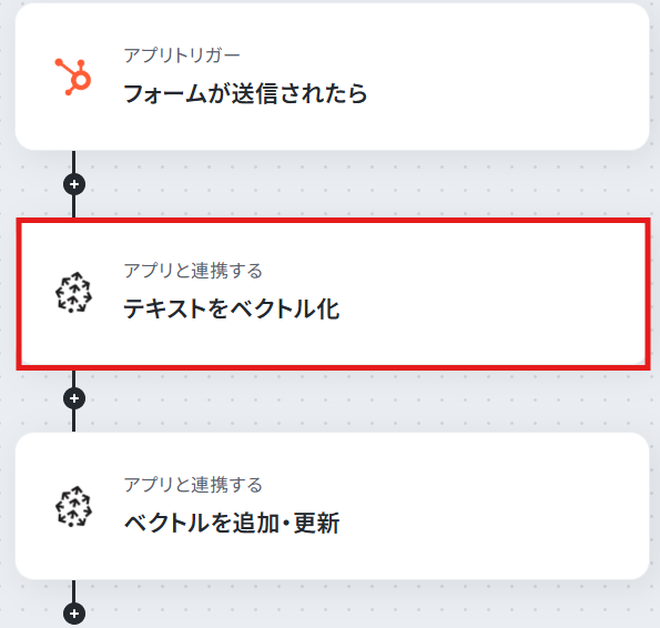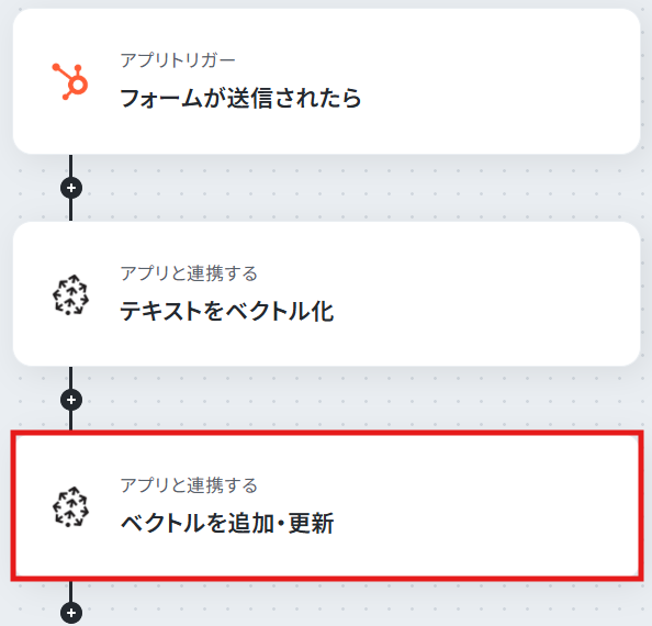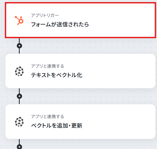 はじめに、HubSpotとPineconeをYoomと連携します。 次に、トリガーでHubSpotを選択し、「フォームが送信されたら」というアクションを設定します。 続けて、オペレーションでPineconeを選択し、「テキストをベクトル化」するアクションを設定します。 最後に、同じくオペレーションでPineconeの「ベクトルを追加・更新」するアクションを設定し、ベクトル化したデータをインデックスに追加します。 ※「トリガー」:フロー起動のきっかけとなるアクション、「オペレーション」:トリガー起動後、フロー内で処理を行うアクション■このワークフローのカスタムポイント