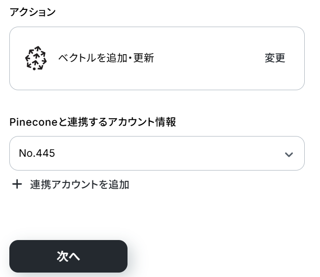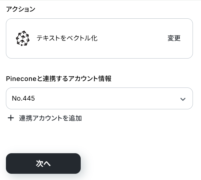Pineconeと連携するアカウント情報を確認したら、「次へ」ボタンをクリックしてください。