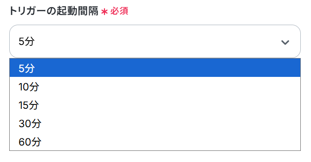 トリガーの起動タイミングは、5分、10分、15分、30分、60分のいずれかで設定できます。ご利用プラン によって、設定できるトリガーの最短間隔が違うので、その点は要チェックです。 なお、基本的にはそのプランの最短の起動間隔にしてお使いいただくことをおすすめします。