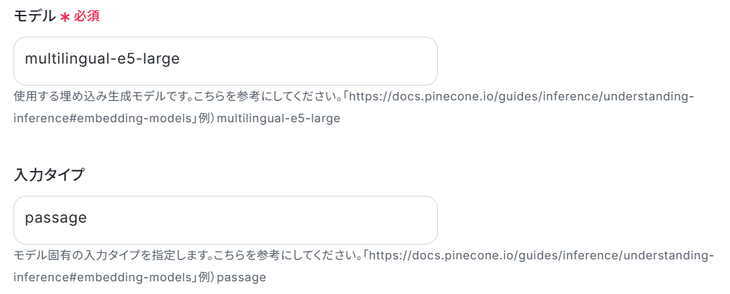 Pineconeの「テキストをベクトル化」アクションでは、ベクトル化の対象とするShopifyの商品情報(商品名、商品説明、タグなど)を任意で設定してください。 Pineconeでベクトルを追加・更新するアクションを設定する際に、対象となるインデックスホストを任意で設定してください。 ■注意事項