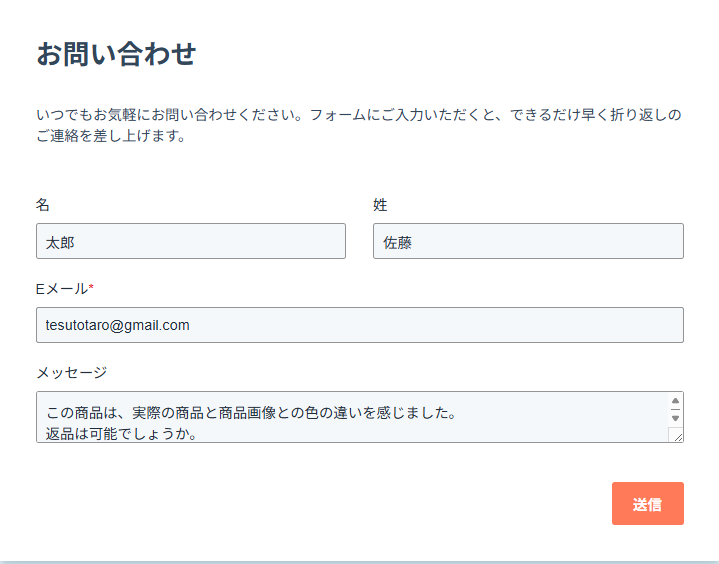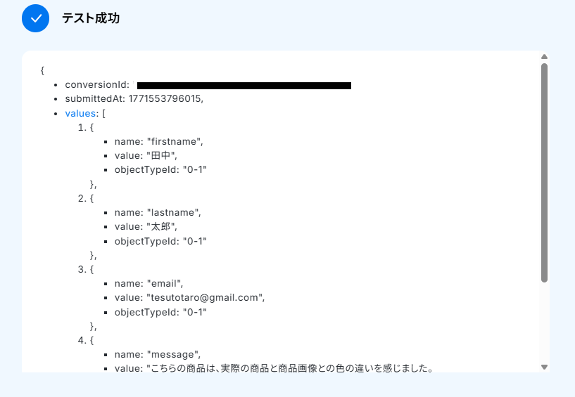 次に、トリガーの動作テストを行います。 HubSpotにログインし、該当フォームにテスト用の回答を送信してください。 (架空の回答で問題ありません。)