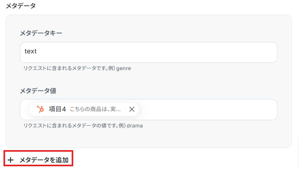 メタデータキーは、用途に合わせて変更してください。 メタデータ値は、取得した値を活用し設定しましょう。 他にも追加したいデータがあれば、「+メタデータを追加」をクリックし設定することが可能です。