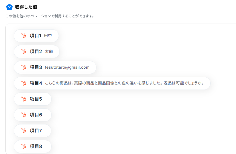 AI機能で「テキストからデータを抽出する」アクションを設定する際、抽出したい内容に合わせてプロンプト(指示文)を自由に編集してください。 HubSpotで「コンタクトの作成」アクションを設定する際に、登録したい情報を任意でマッピングできます。 ■注意事項