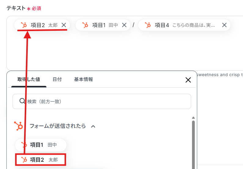 テキストは、デフォルトで下記画像のように設定されています。 こちらの項目は変更可能なため、用途に合わせて、使用する「取得した値」を変更し設定してください。 ※取得した値を利用することで、トリガーが起動するたびに最新の値を自動で引用することが可能です。