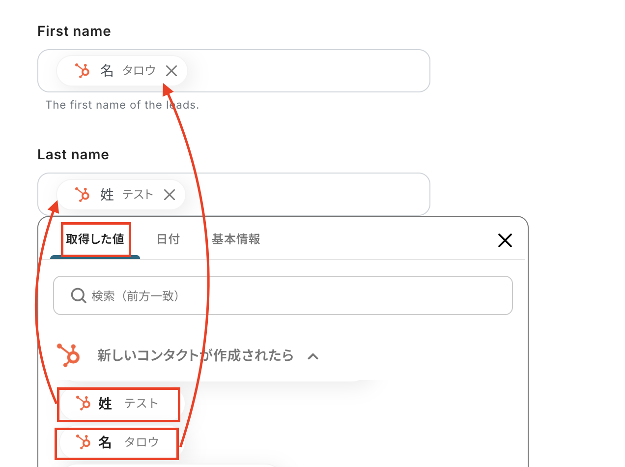 First nameとLast nameも同様にHubSpotの取得した値から選択してください。