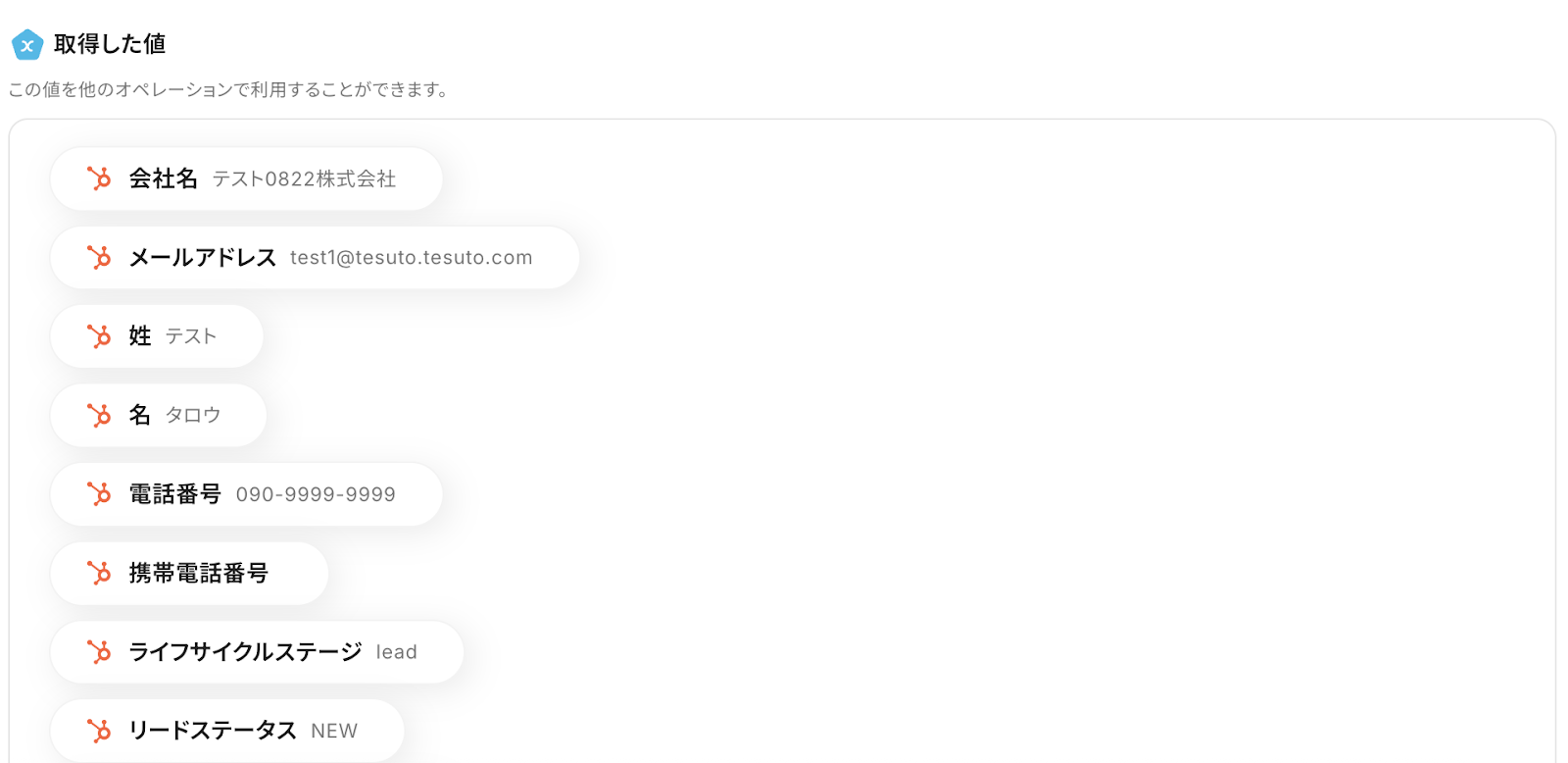 テストが成功すると、取得した値にHubSpotの情報が追加されます。
