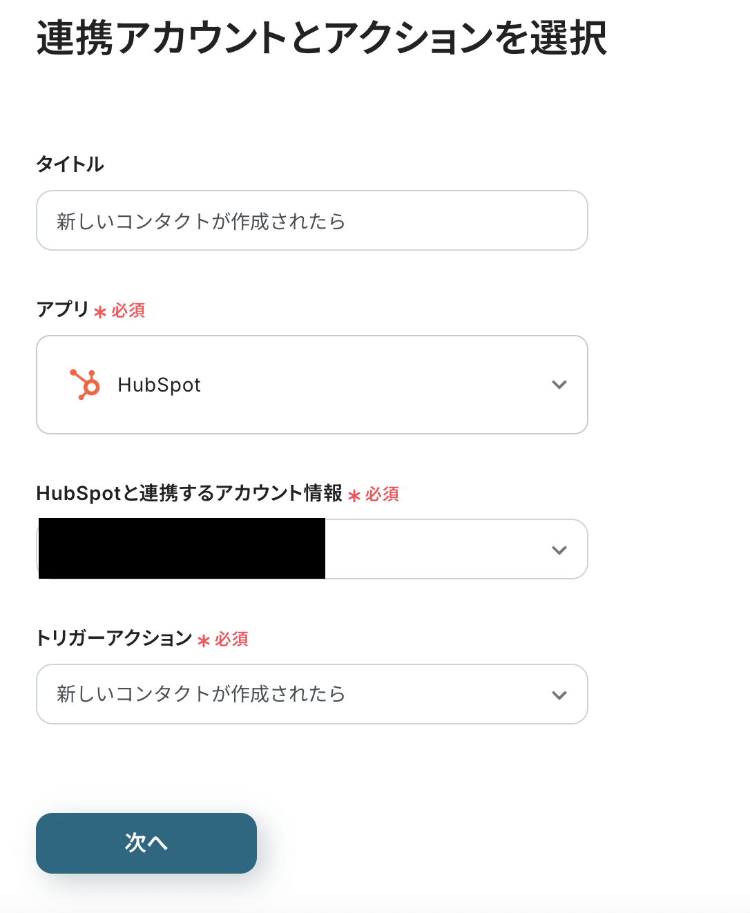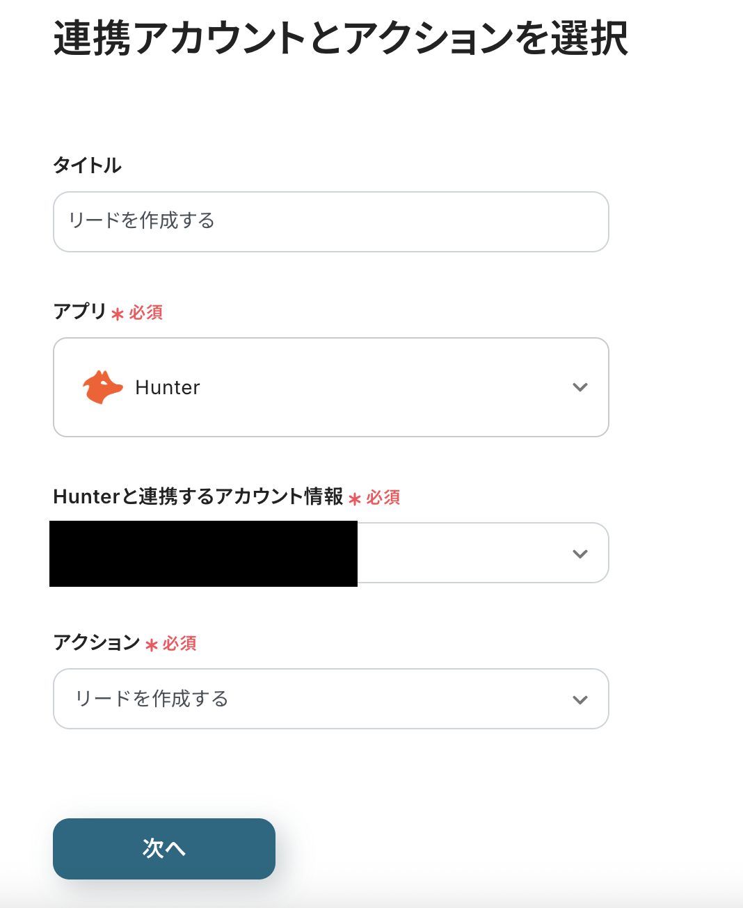 連携アカウントとアクションを選択する画面は、以下を確認し、次へをクリックしましょう。