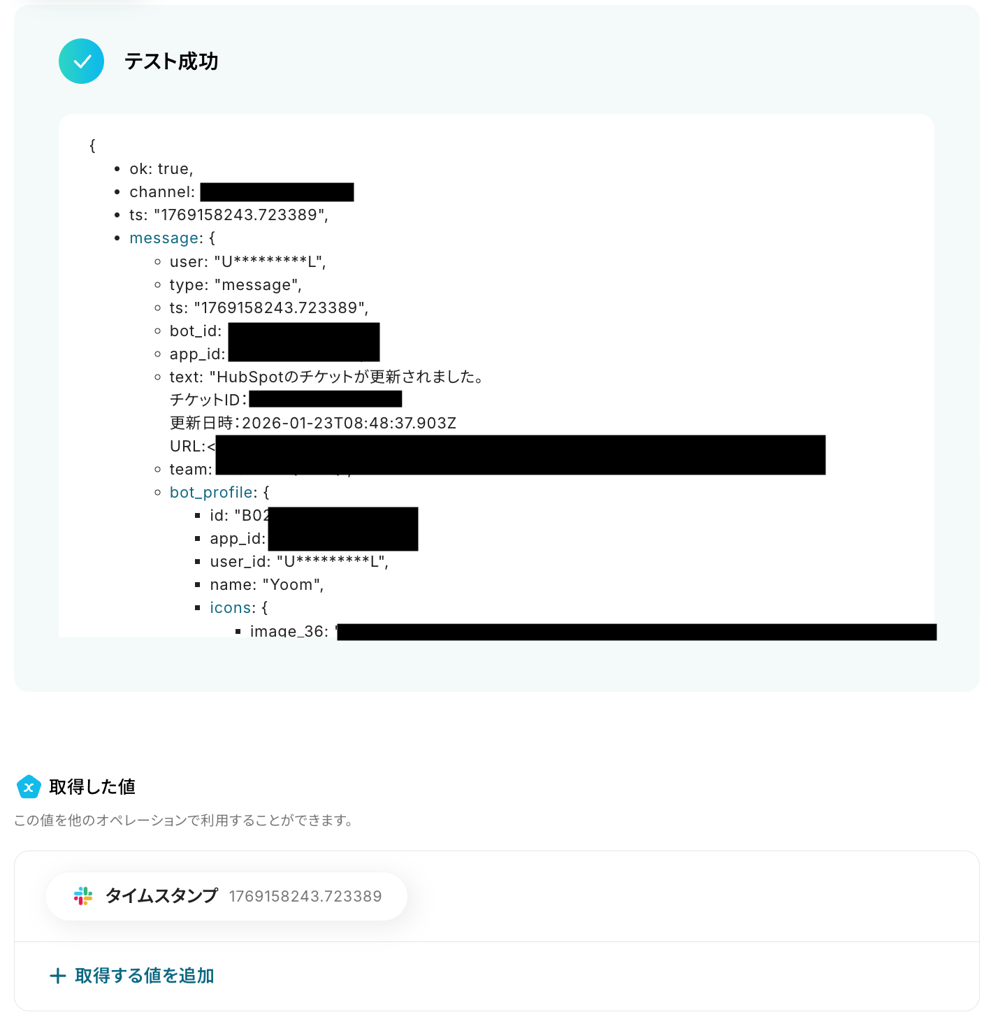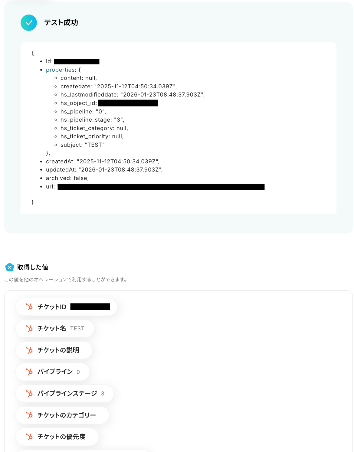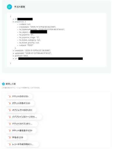 テストに成功すると、HubSpotで更新されたチケットに関する情報が表示されます。