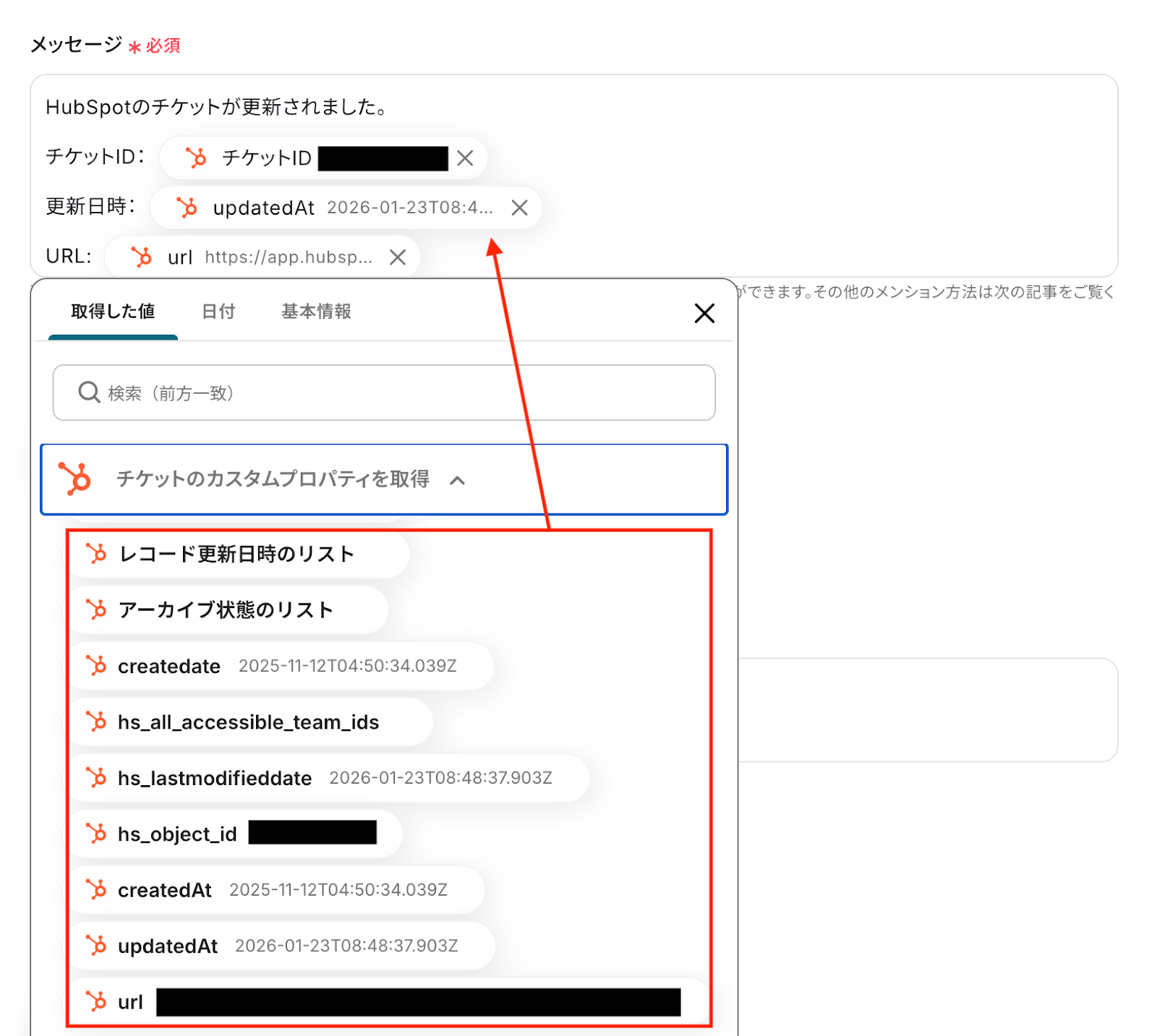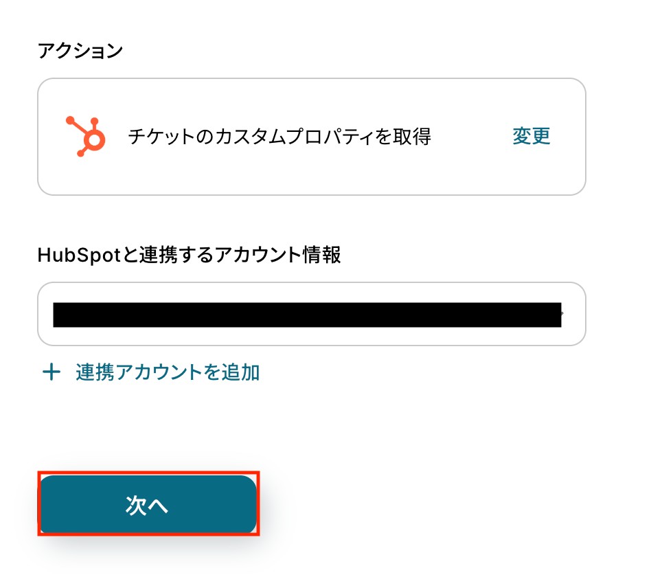 - HubSpotの「チケットのカスタムプロパティを取得」アクションでは、取得したいカスタムプロパティの内部名を任意で設定してください。