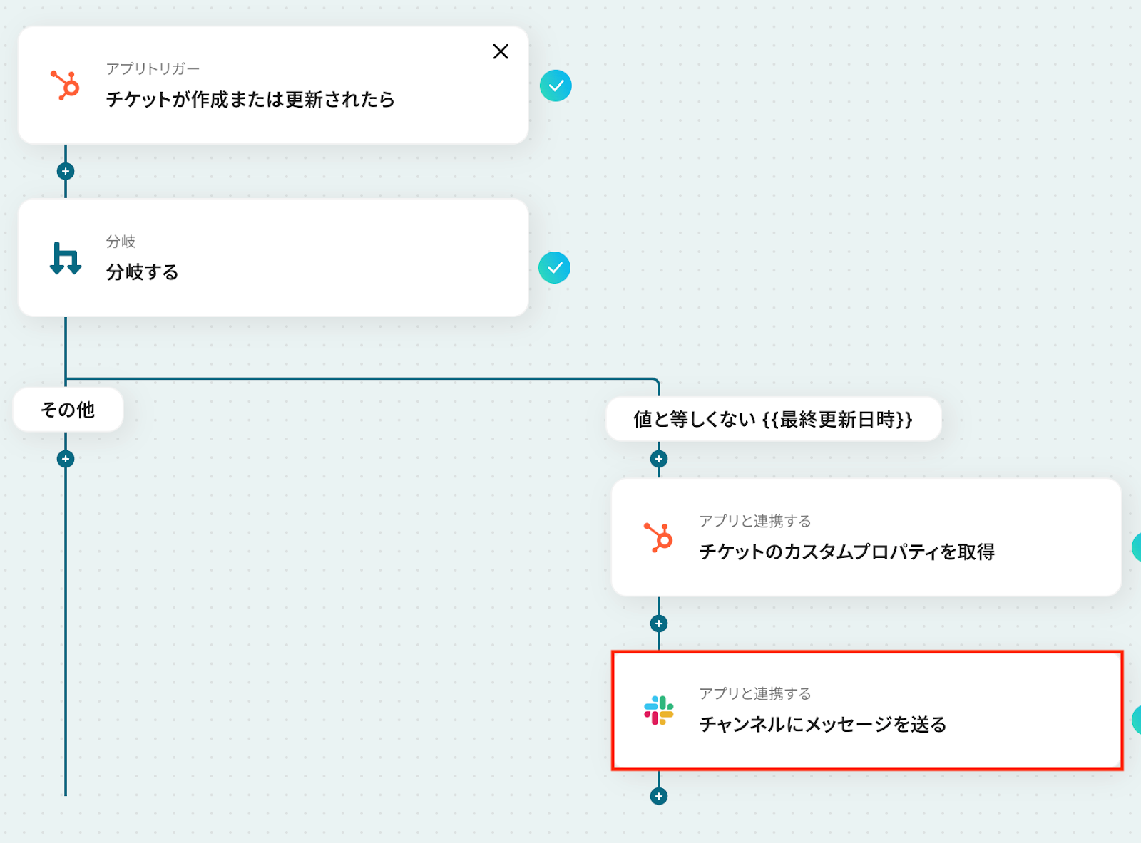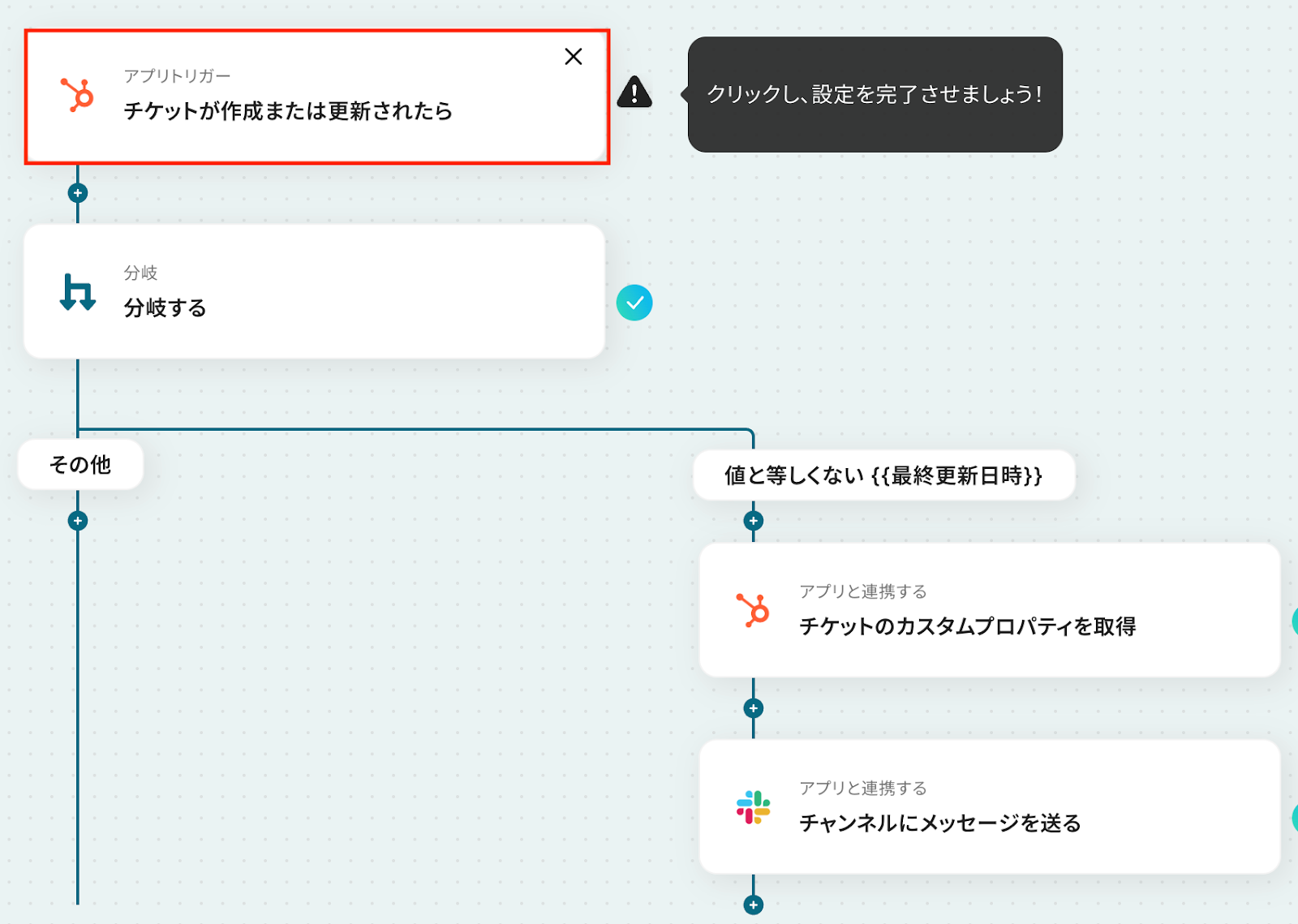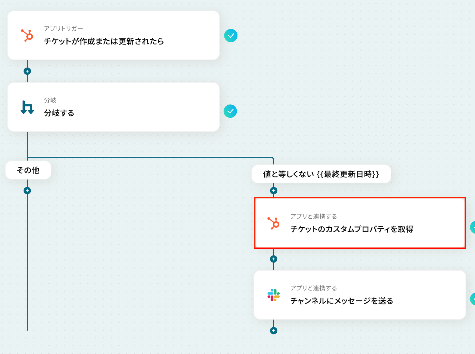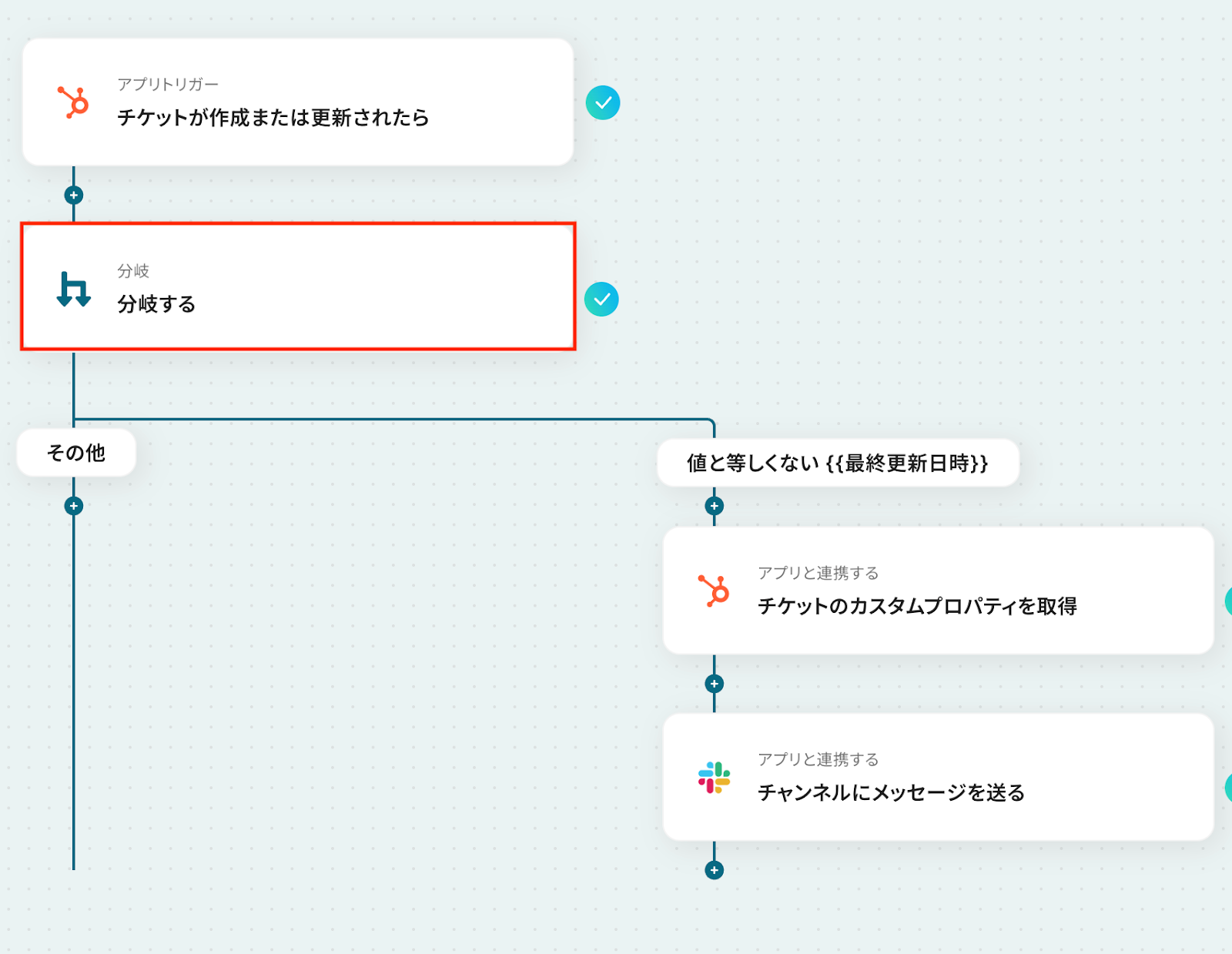 続いて、HubSpotのチケットが更新された場合にのみ、フローを起動する分岐の設定を行いましょう。