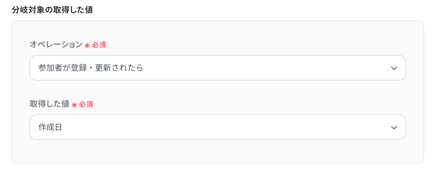 - 次に、オペレーションで「分岐機能」を利用し、更新時のみ後続処理に進むように設定します