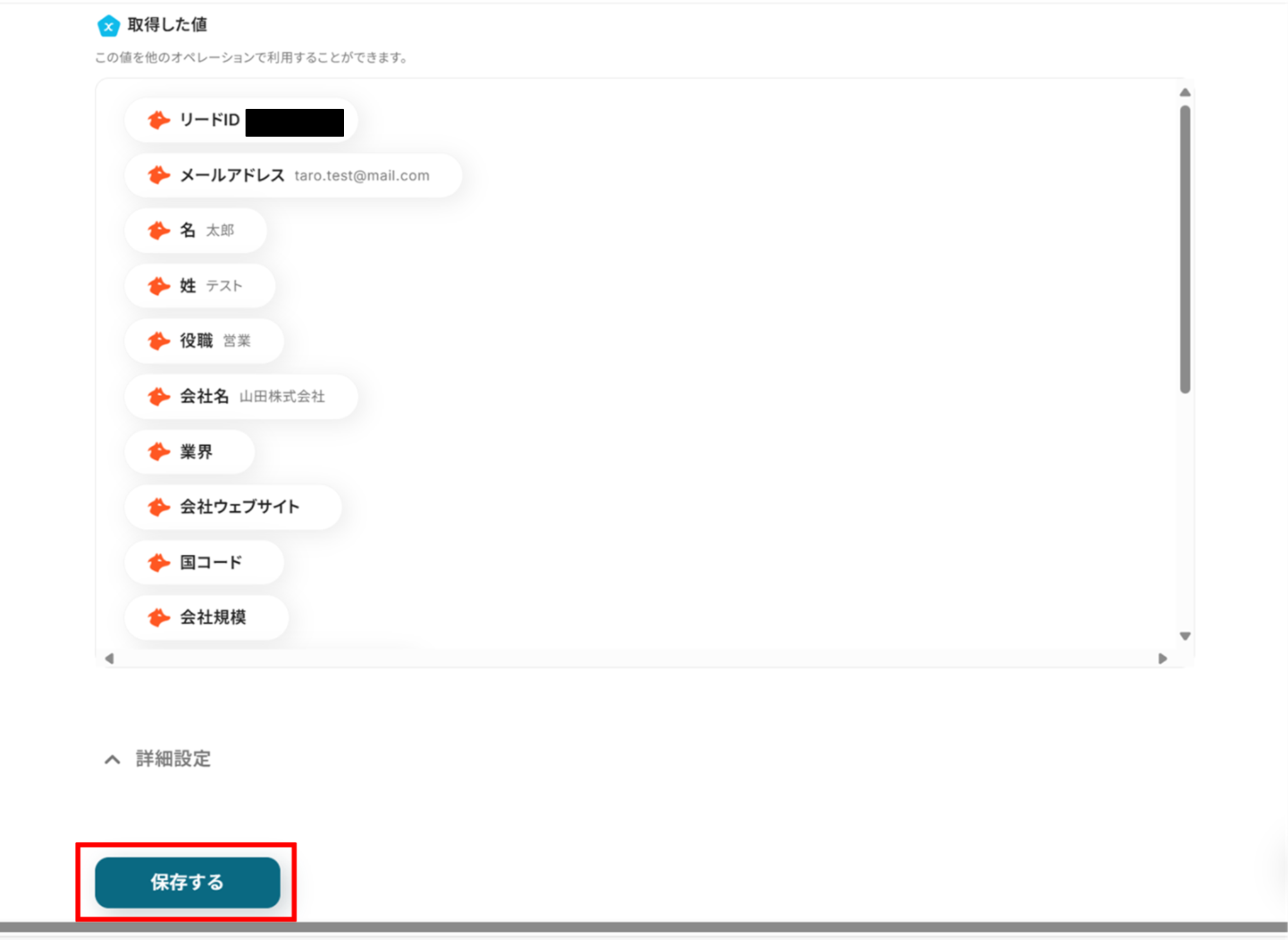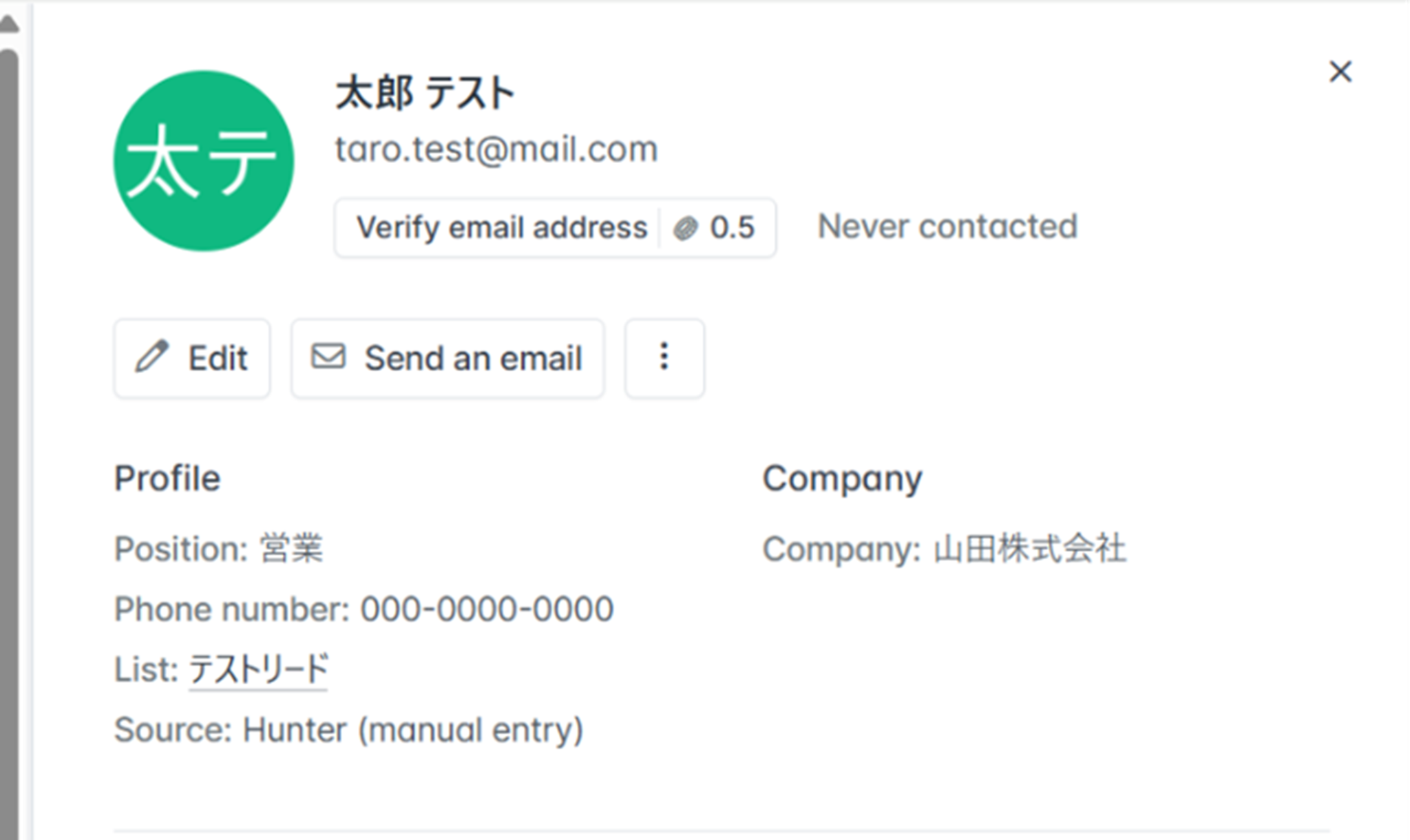 入力が終わったら「テスト」をクリックする前にHunterにテスト用のリード情報を登録します。