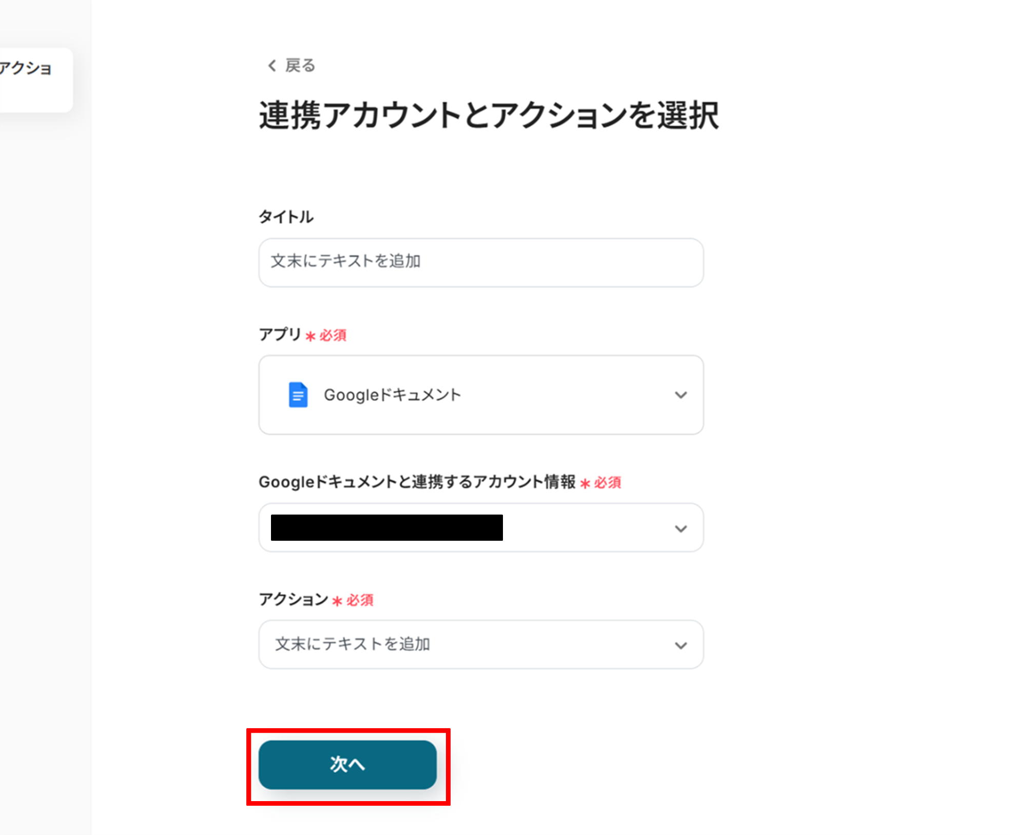 (2)「連携アカウントとアクションを選択」画面から、Googleドキュメントと連携するアカウント情報に誤りがないかを確認し、アクションは「文末にテキストを追加」のままで「次へ」をクリックします。