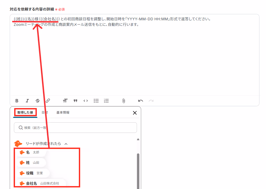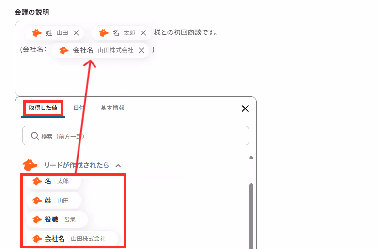 「トピック」と「会議の説明」は、取得した値を利用して設定ができます。