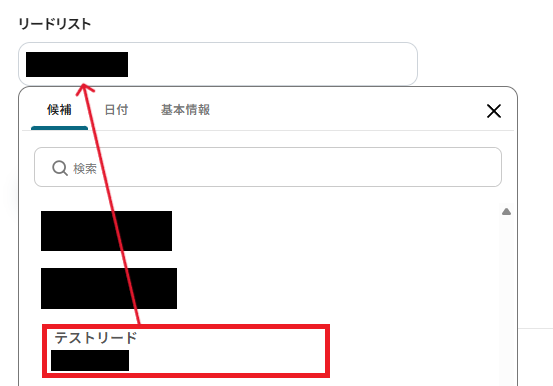 入力欄をクリックすると、連携しているアカウントから候補が表示されるため、対象となるリードリストを選択してください。