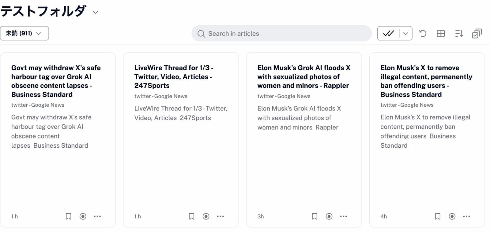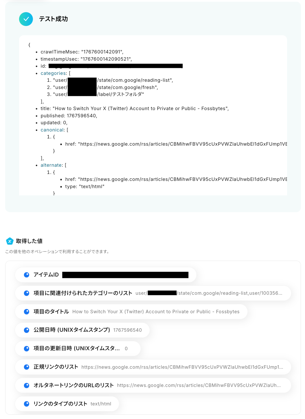テストに成功すると、Inoreaderのフォルダに公開されたコンテンツに関する情報が表示されます。
