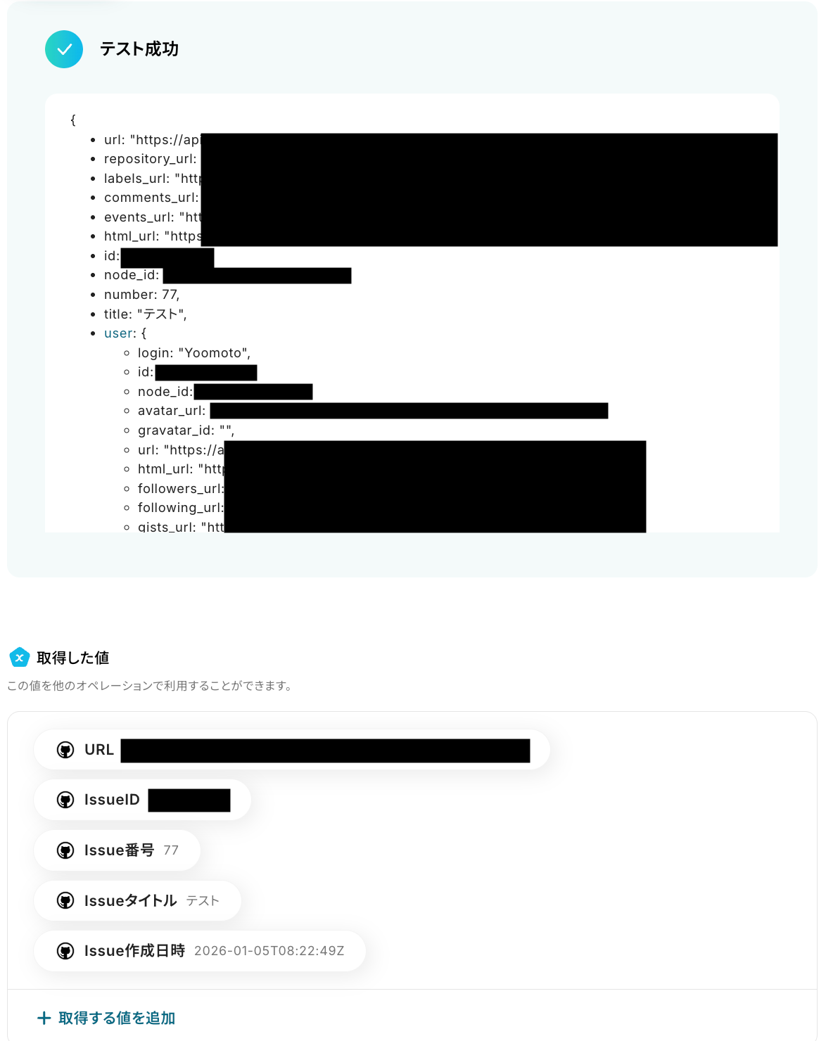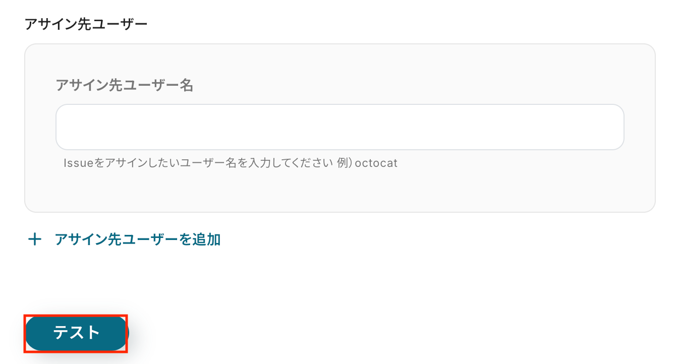 入力が完了したら「テスト」をクリックして、設定した内容でGitHubにIssueが作成されるか確認しましょう。