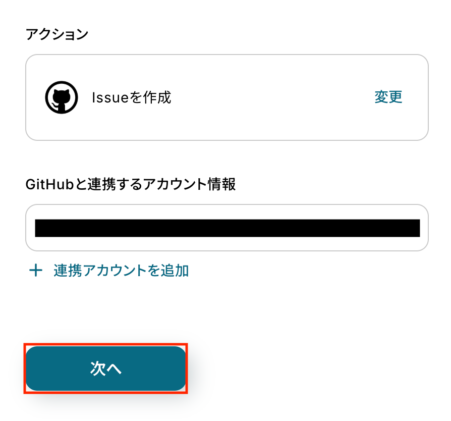 - 最後に、オペレーションでGitHubの「Issueを作成」アクションを設定し、AIが抽出した情報を埋め込んでIssueを作成します。