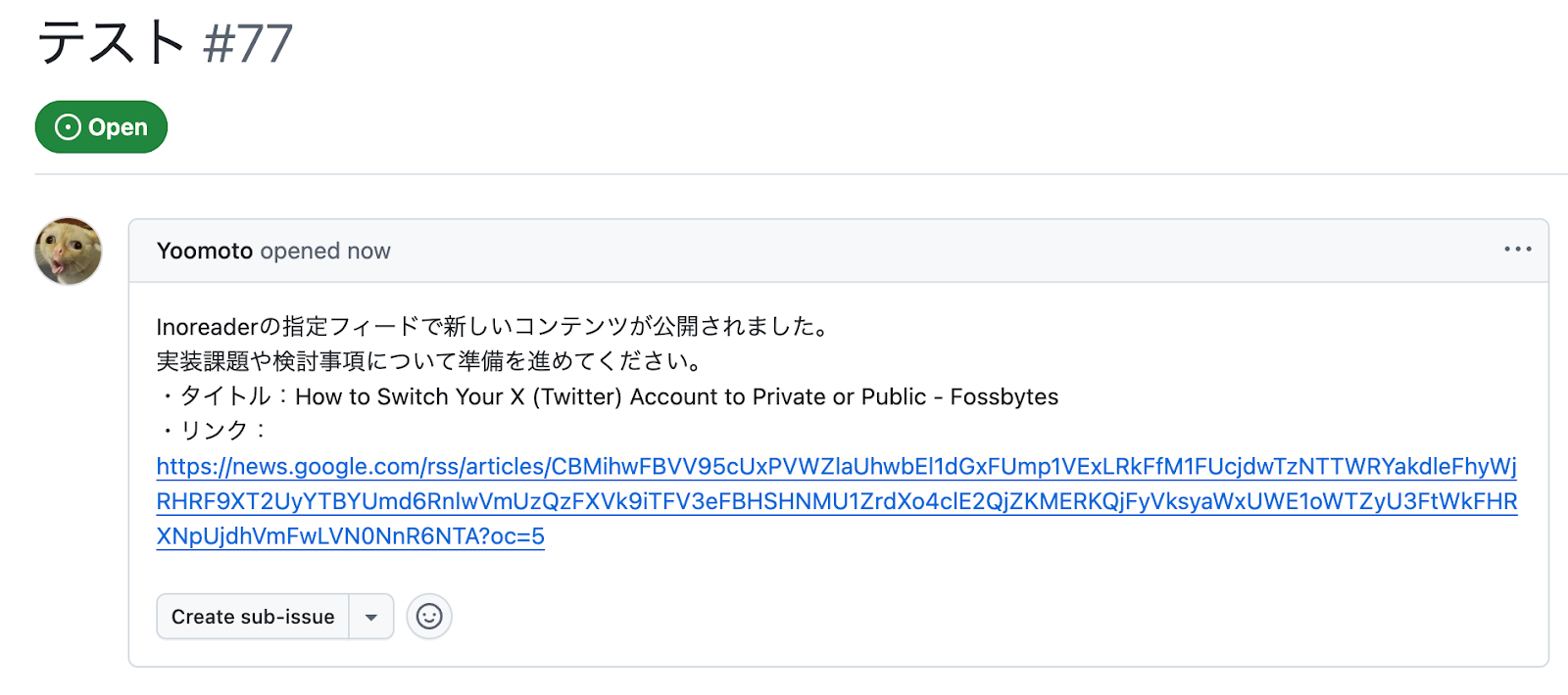 Inoreaderの指定フィードで新しいコンテンツが公開されたら、GitHubでIssueを作成する