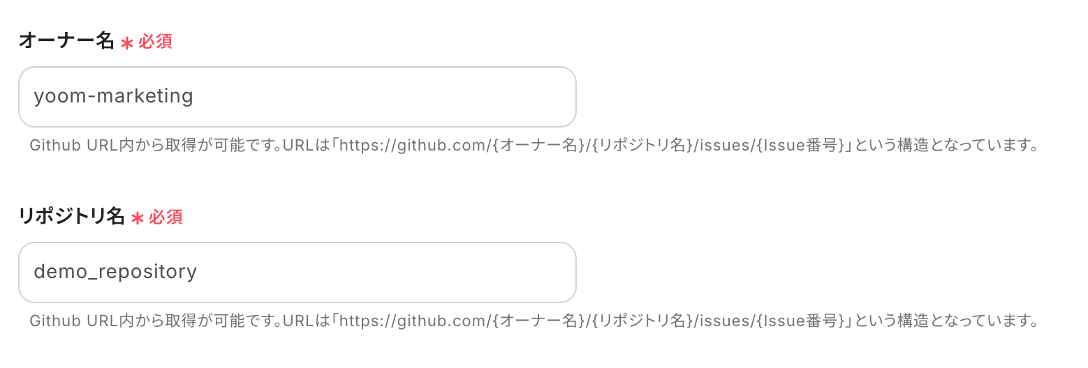 ・GitHubの「Issueが新しく作成または更新されたら」というトリガーで、オーナー名とリポジトリ名を指定してください。
