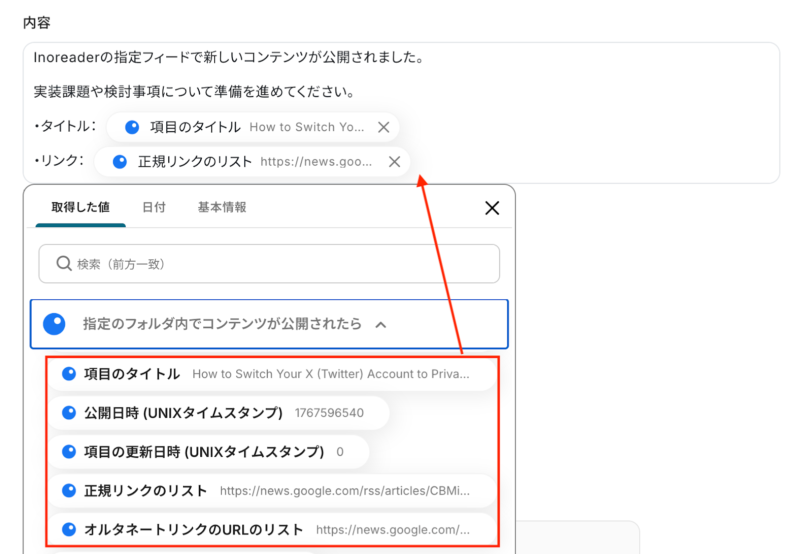 入力欄をクリックすると、前のステップでInoreaderから取得した値が表示されるので、選択して入力しましょう。