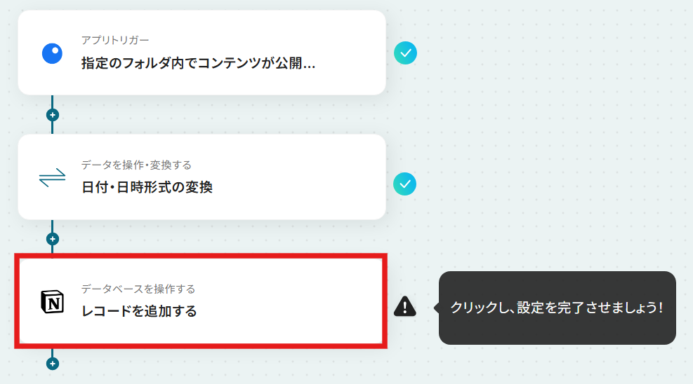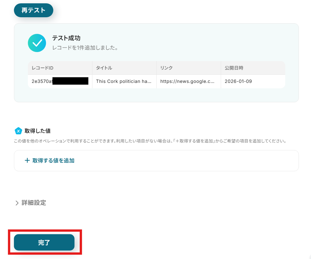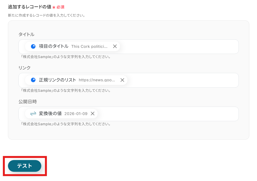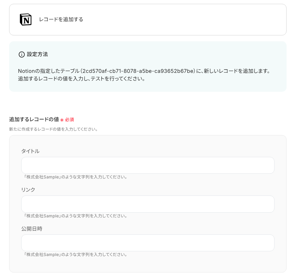 - 最後に、オペレーションでNotionの「レコードを追加する」アクションを設定し、記事タイトルやURL、整形した日付などを指定のデータベースに追加します。