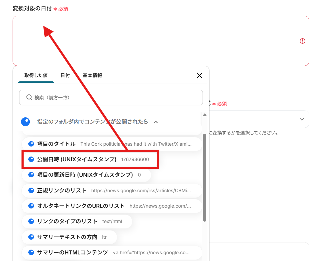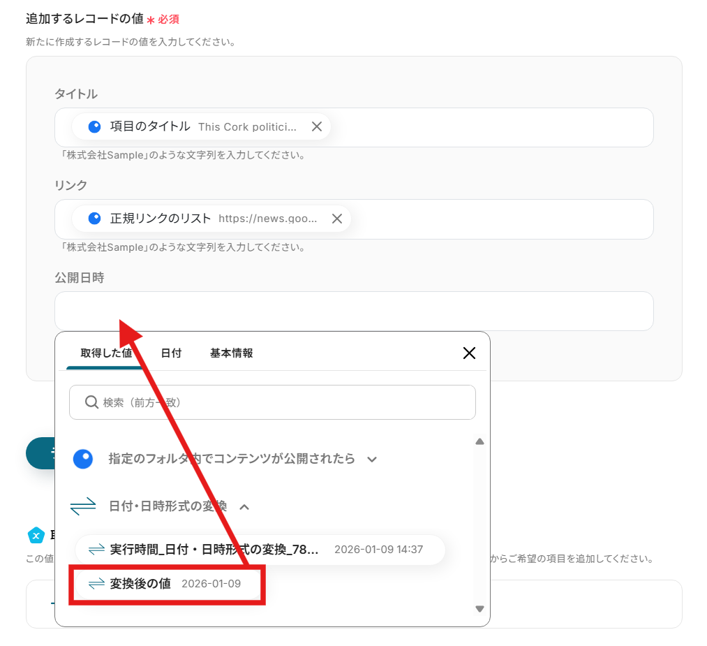 変換対象の日付のボックス内をクリックし、1つ前の項目で取得した値である「公開日時」を挿入します。