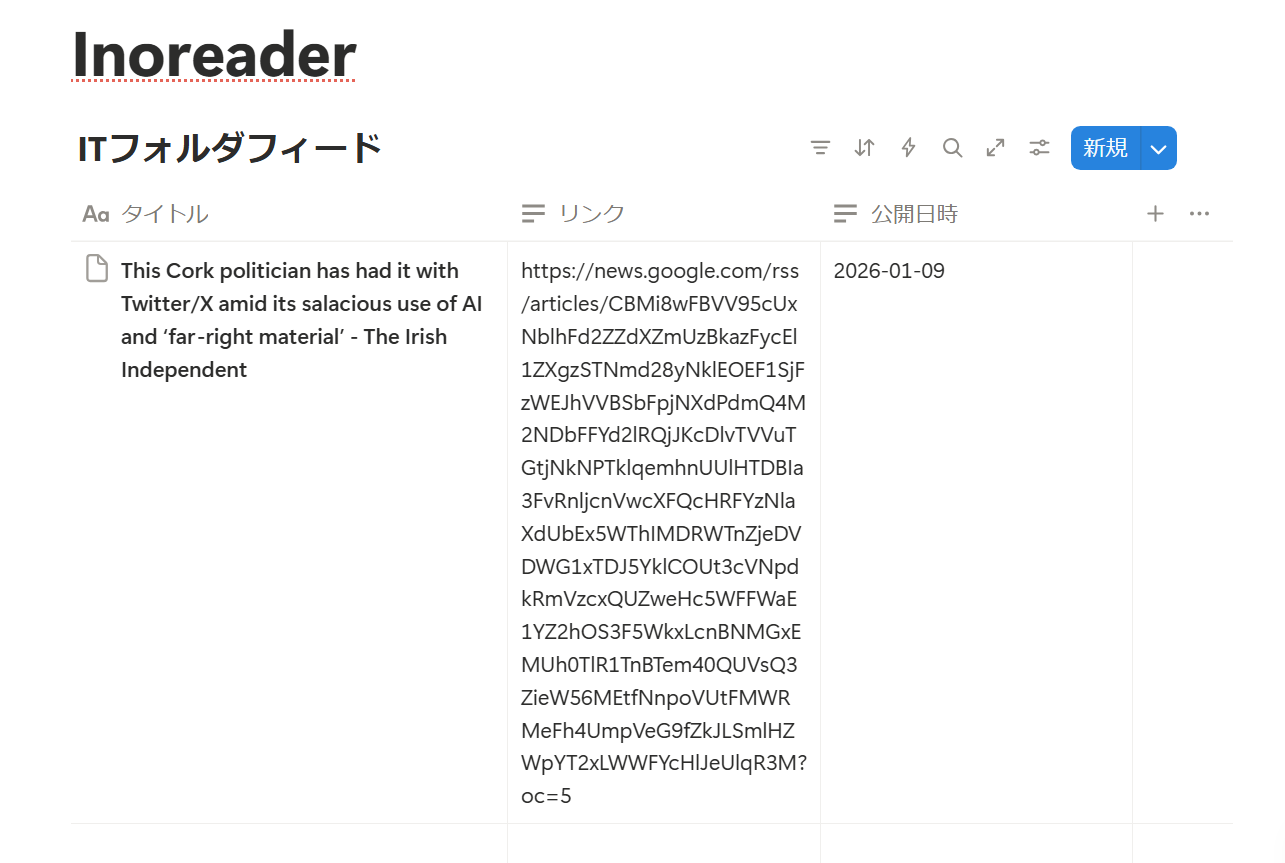- Inoreaderの指定フォルダにコンテンツが追加されると自動でNotionに記録されるため、手作業での転記時間を削減できます。