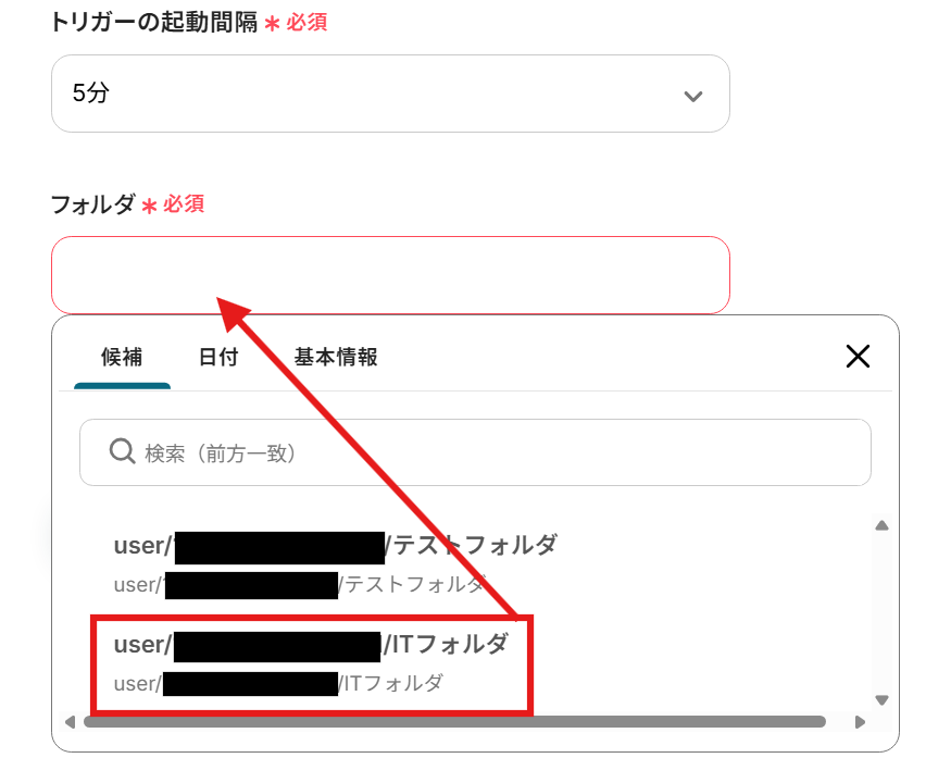 続けてYoomと連携させたい任意のフォルダを指定します。ボックス内をクリックすることでフォルダを指定可能です。