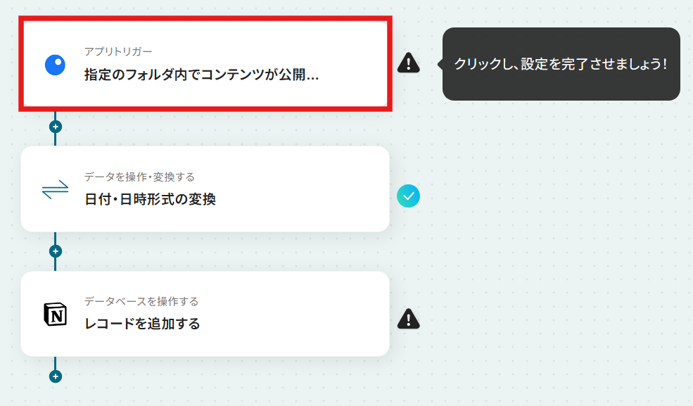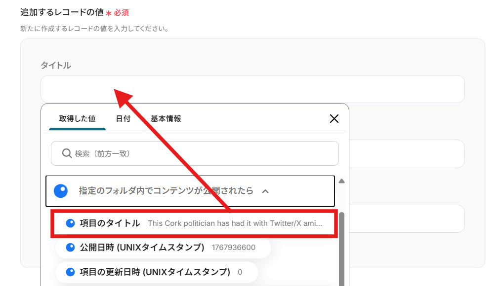 タイトルなどは「指定のフォルダ内でコンテンツが公開されたら」の取得した値を使用し、公開日時には「日付・日時形式の変換」から「変換後の値」を使用しましょう。