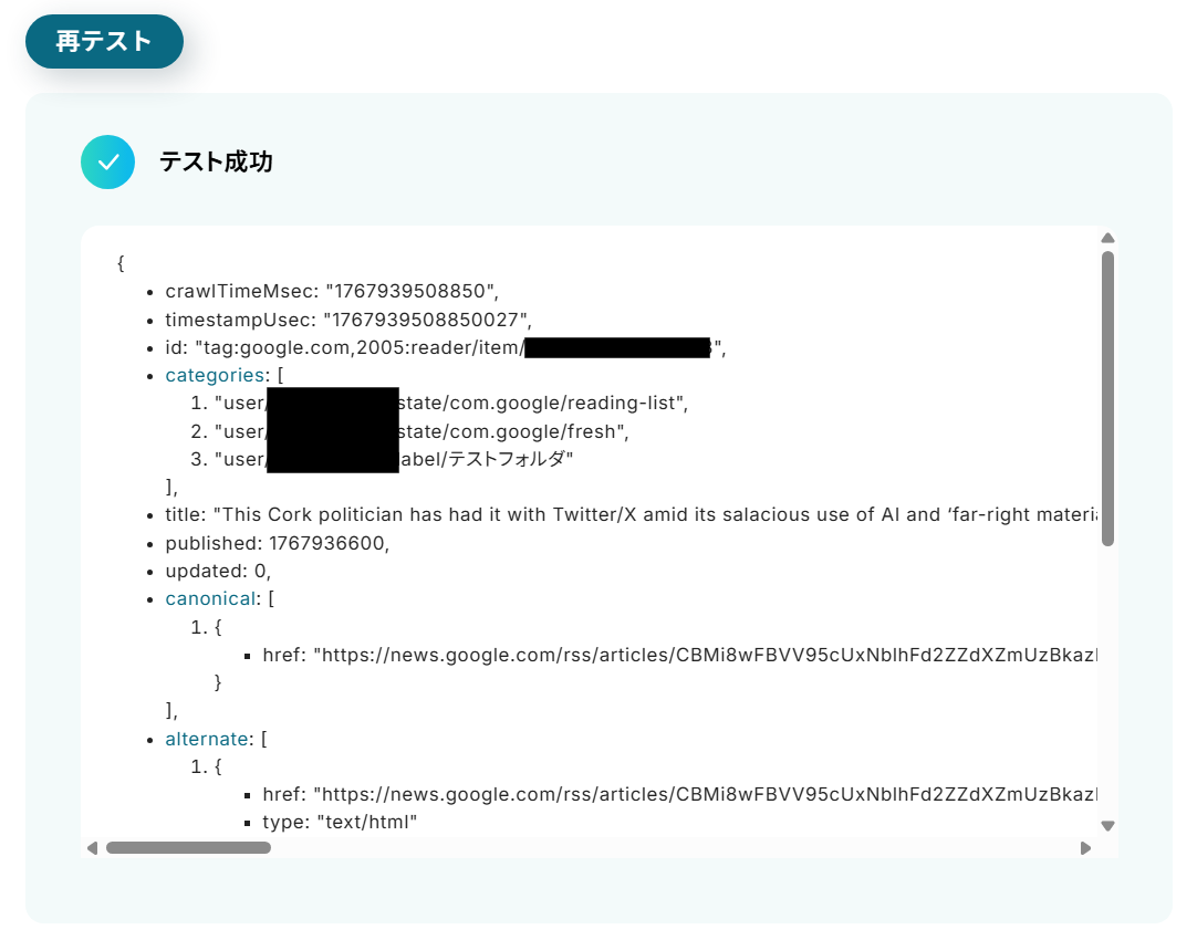 以下のようにテスト成功画面が表示され、指定したプロパティにInoreaderのデータが挿入されていれば完了です。