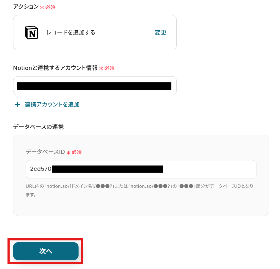 アクションがレコードを追加するになっていることを確認しましょう。Notionと連携するアカウント情報はマイアプリ連携時に設定したものを選択してください。