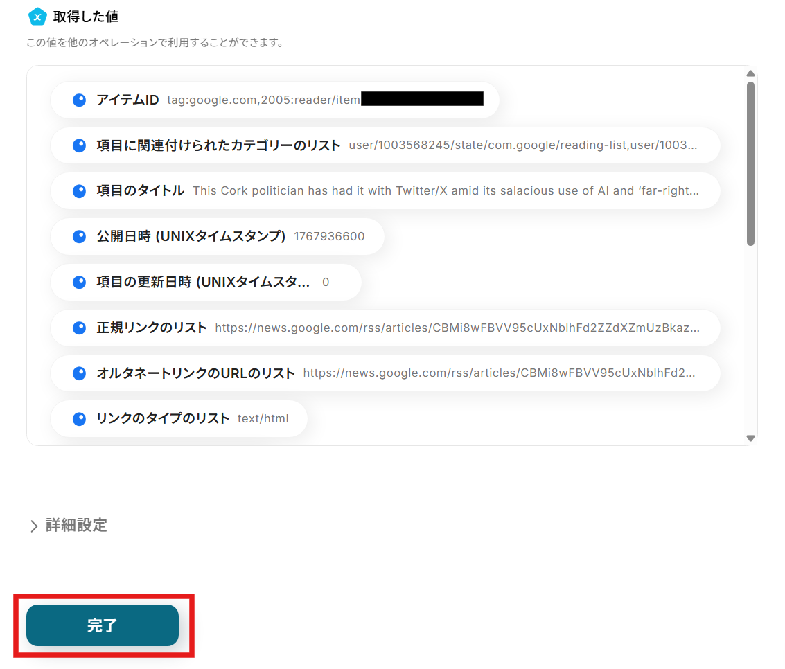 テストが成功するとテスト成功画面と取得した値が表示され、指定のフォルダコンテンツが確認できます。「完了」をクリックして設定完了です!