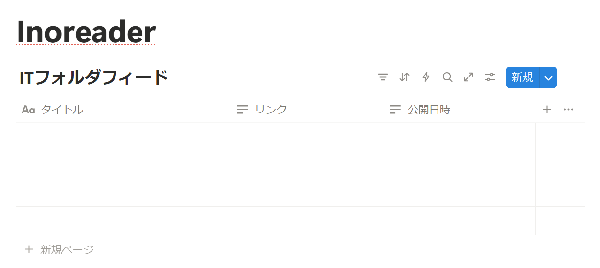 今回はInoreaderのデータをNotionに蓄積するフローとなります。そのため、あらかじめNotionのデータベースをこの段階で用意しておきましょう。