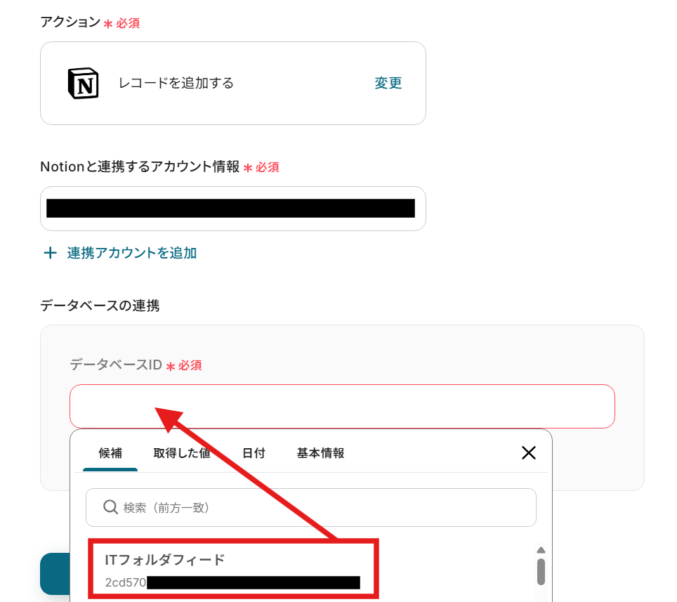 - Notionでレコードを取得するアクションでは、情報収集の元となるデータベースを任意で設定してください。
